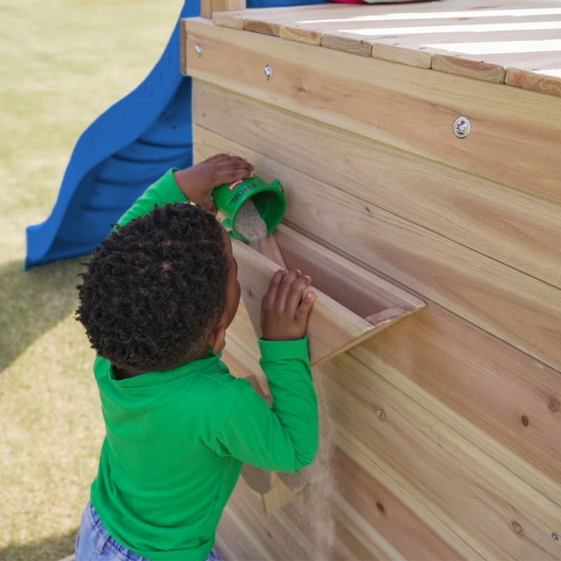 - Piaskownica z Daszkiem: Przestronna piaskownica (wymiary 83,2 x 80 x 18,8 cm, pojemność 125 kg piasku) z osłoną.