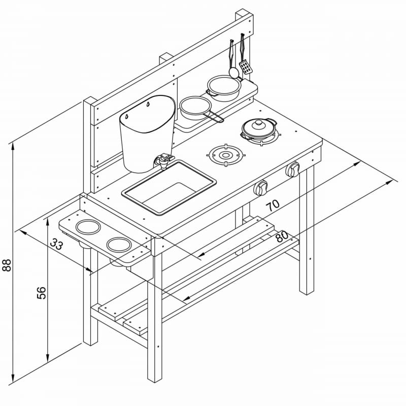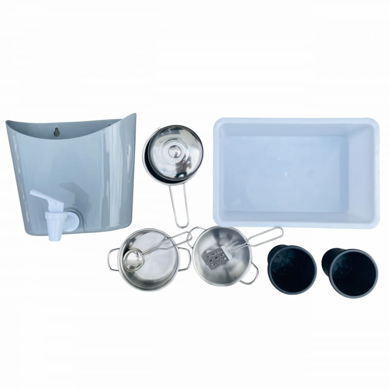 To, co wyróżnia ten model, to system wodny. AXI Drewniana Kuchnia posiada zbiornik o pojemności 0,33 L oraz kran, co pozwala dzieciom na realną zabawę z cieczą. Wyjmowany pojemnik pod zlewem ułatwia utrzymanie czystości i umożliwia szybką zmianę wody na piasek.