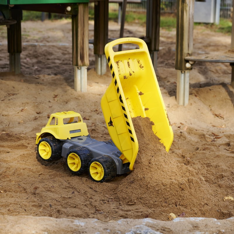 - jaskrawożółty kolor i nowoczesne naklejki sprawiają, że wygląda jak prawdziwa wywrotka