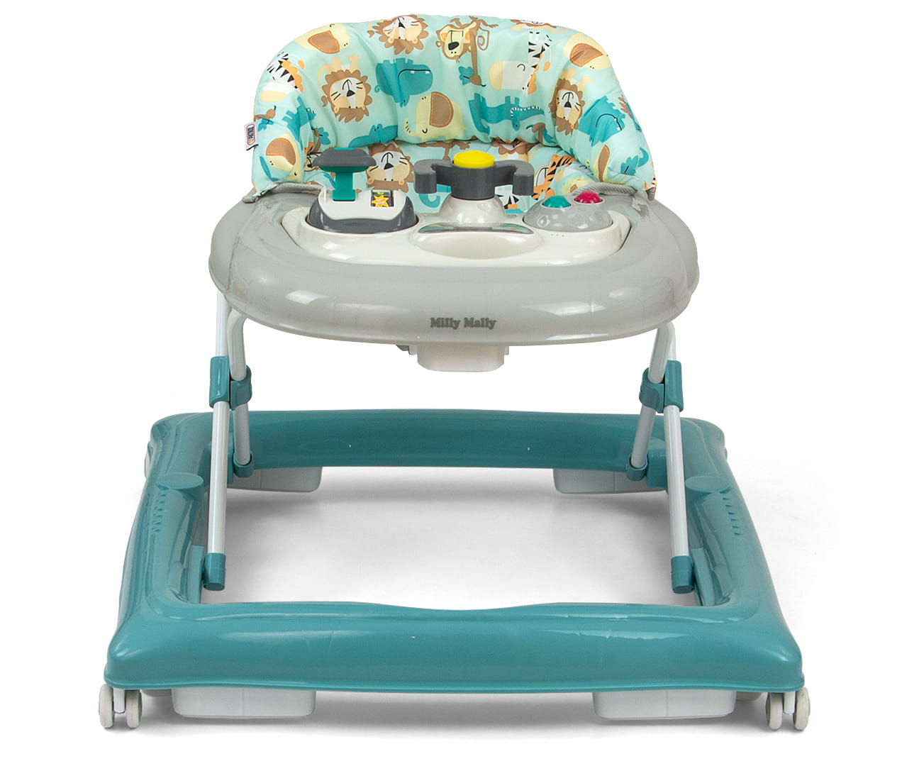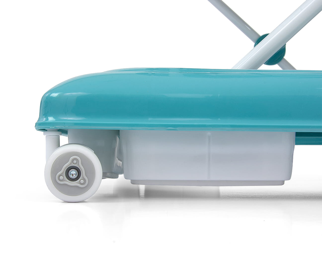 Cztery wysokiej jakości obrotowe kółka, które nie rysują powierzchni, po której się poruszają, zapewnią swobodę przemieszczania a osiem gumowych stoperów ochroni dziecko przed zjechaniem ze schodów lub innych przeszkód.