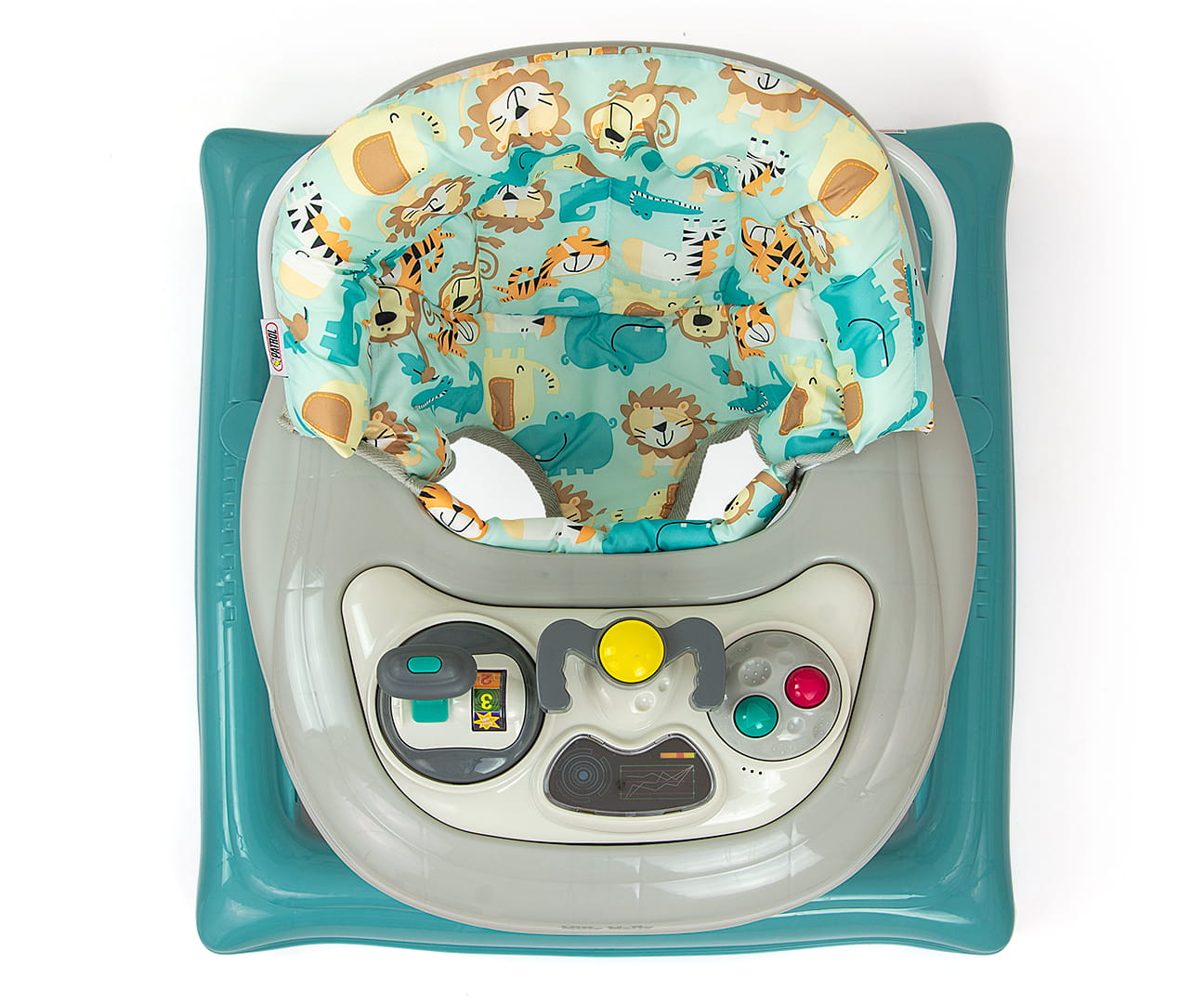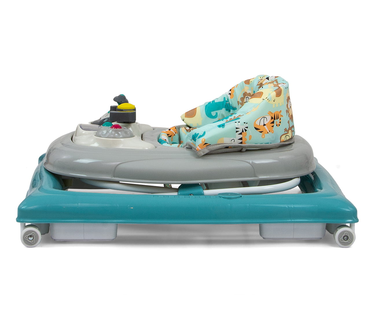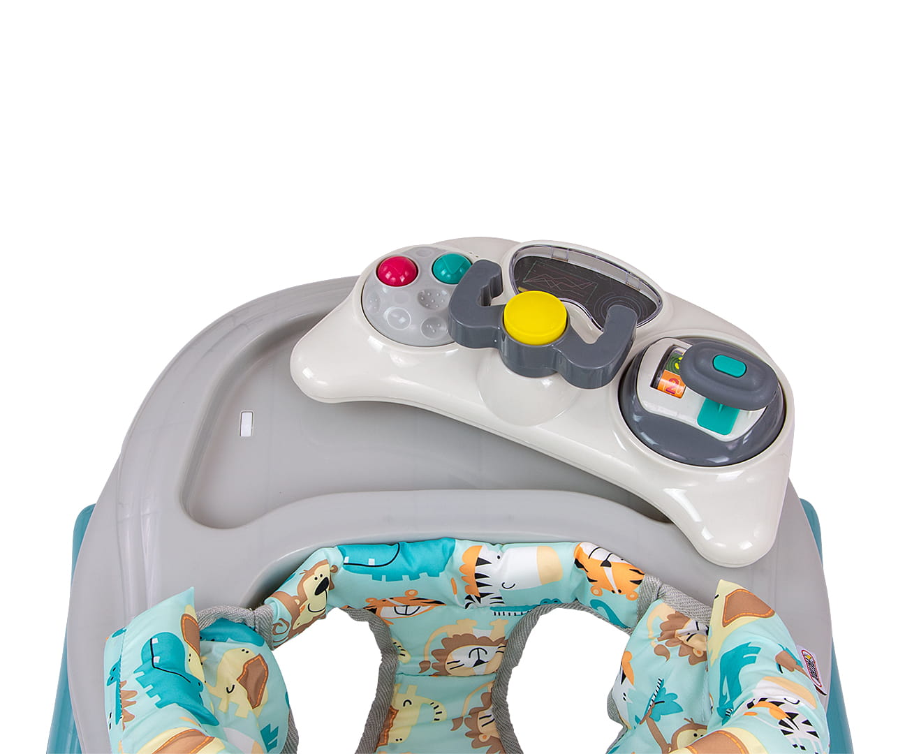 Produkt posiada edukacyjny panel, który zawiera szereg niespodzianek czekających na małych odkrywców: światełka, piszczałki, melodyjki, grzechotka, przyciski i inne ruchome elementy. Po wypięciu panelu z tacki chodzika posłuży on jako niezależna zabawka, np. jako umilacz w podróży, a blat przyda się jako stolik do zabaw.