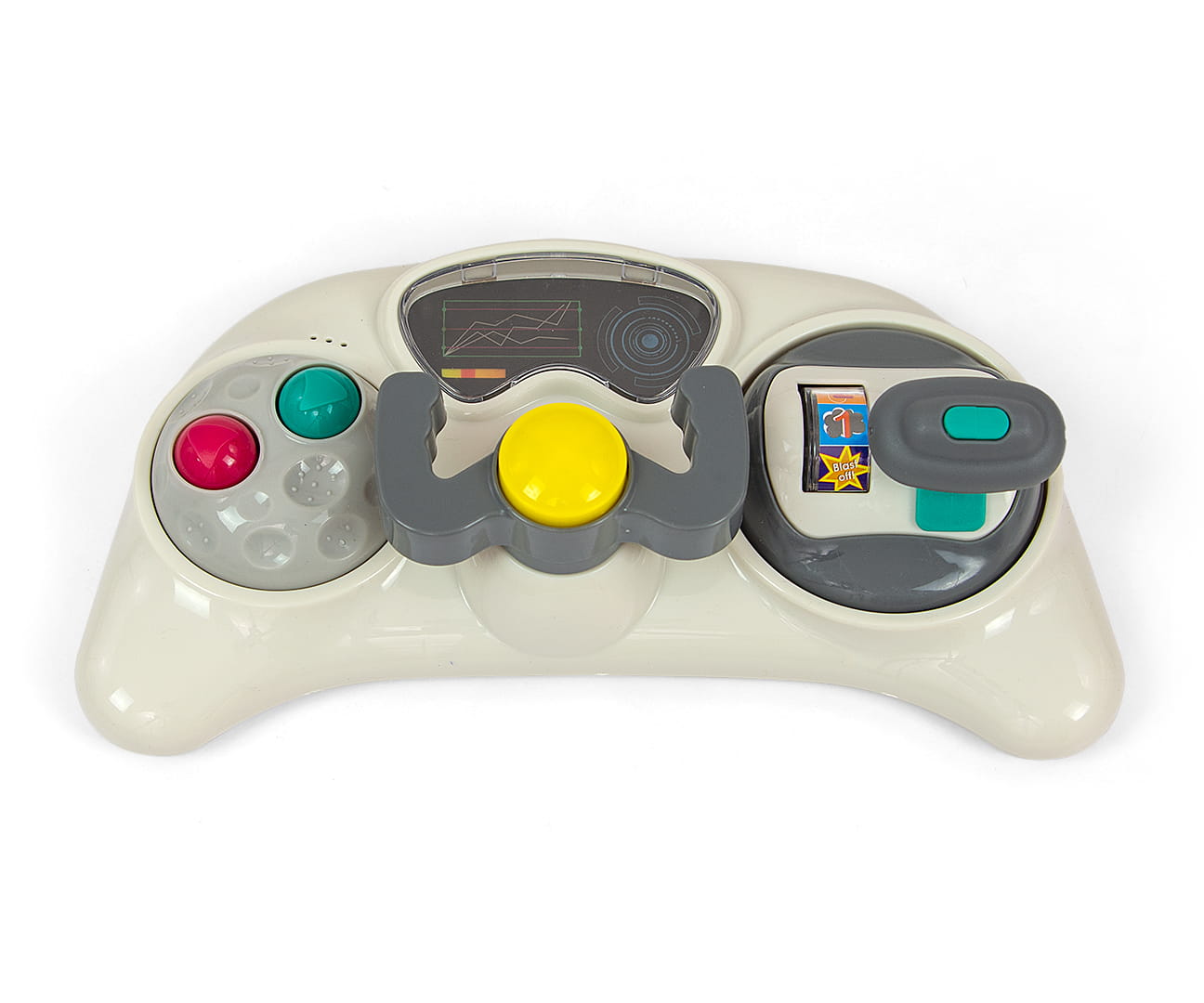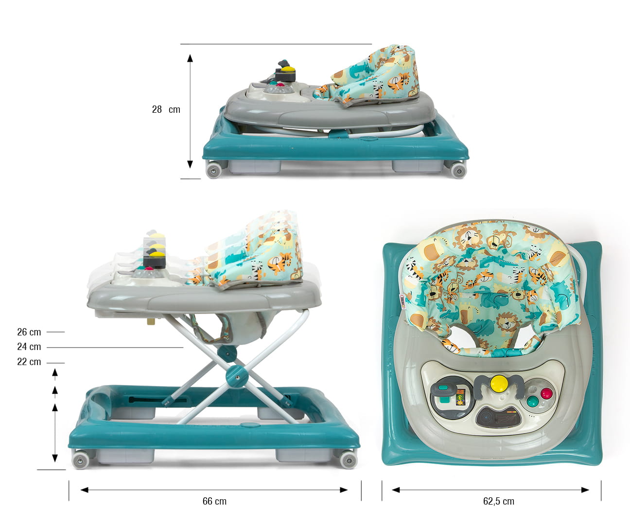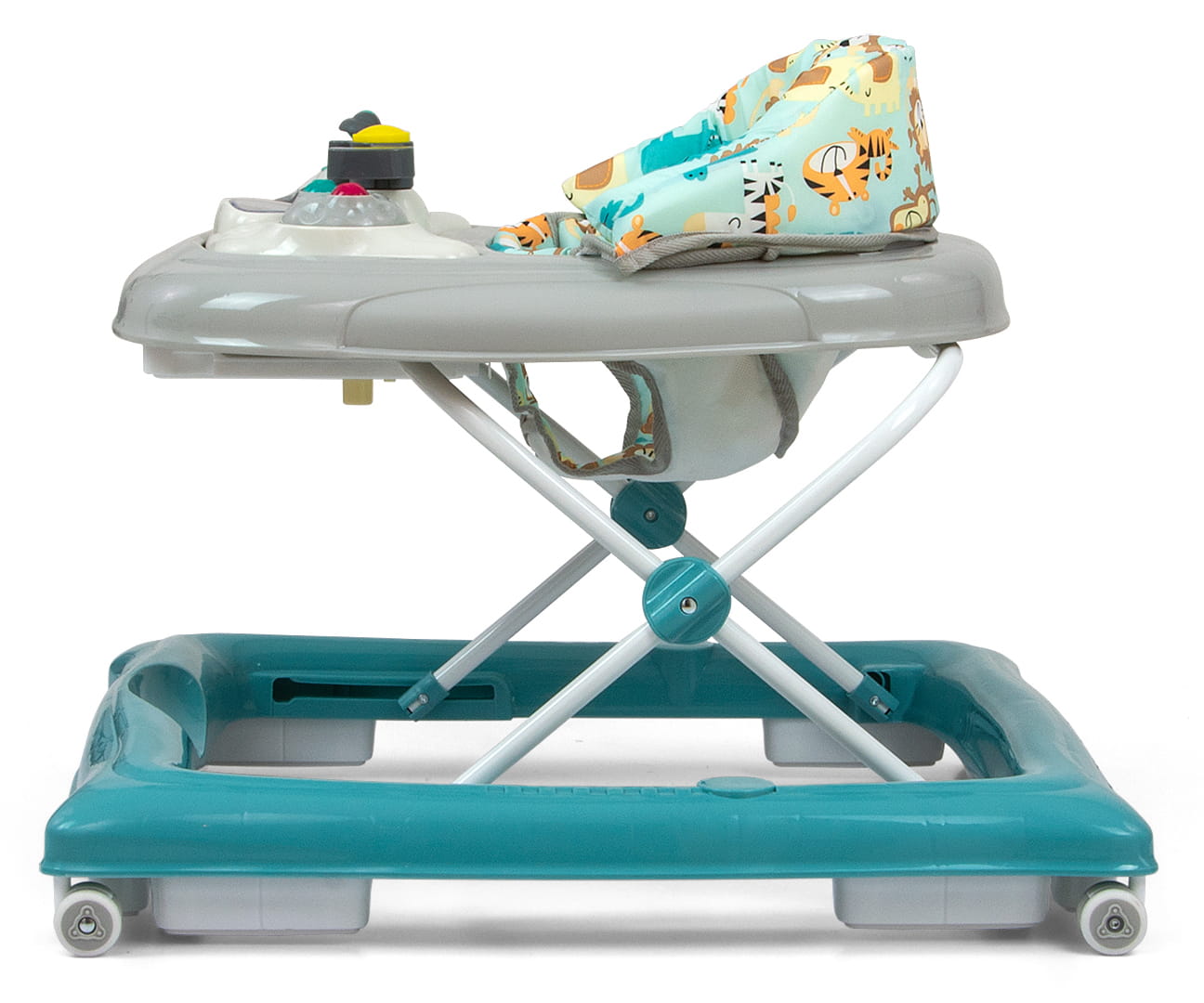 Produkt posiada edukacyjny panel, który zawiera szereg niespodzianek czekających na małych odkrywców: światełka, piszczałki, melodyjki, grzechotka, przyciski i inne ruchome elementy. Po wypięciu panelu z tacki chodzika posłuży on jako niezależna zabawka, np. jako umilacz w podróży, a blat przyda się jako stolik do zabaw.