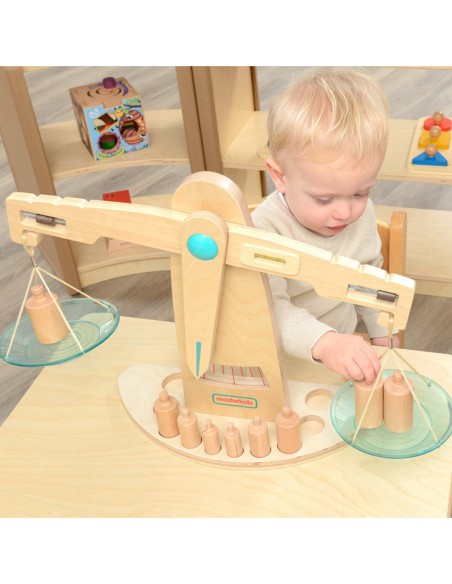 - Nauka przez doświadczenie: Do zestawu dołączono aż 10 drewnianych odważników, dzięki którym dziecko może samodzielnie badać relacje między przedmiotami o różnej masie.