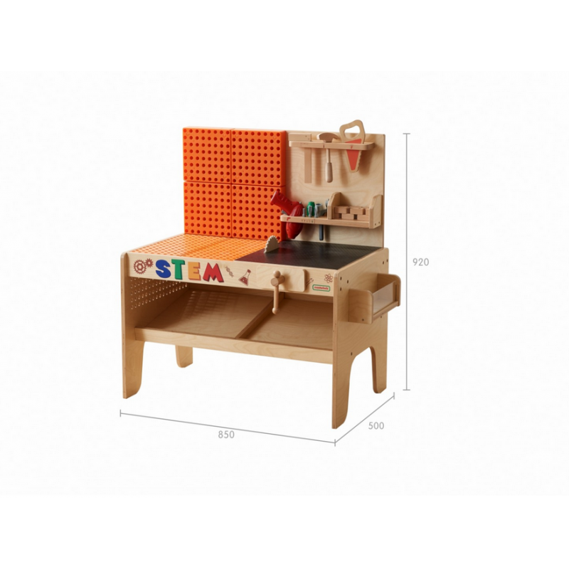 Warsztat zawiera różnorodne drewniane narzędzia, śruby, kołeczki i elementy konstrukcyjne, które pozwalają dzieciom eksperymentować i rozwijać zdolności techniczne. Solidna drewniana konstrukcja zapewnia trwałość i bezpieczeństwo, a ergonomiczny układ ułatwia pracę małym rączkom. To idealna zabawka do przedszkoli, szkół i domowych kącików edukacyjnych, wspierająca rozwój STEM i samodzielność dziecka.
