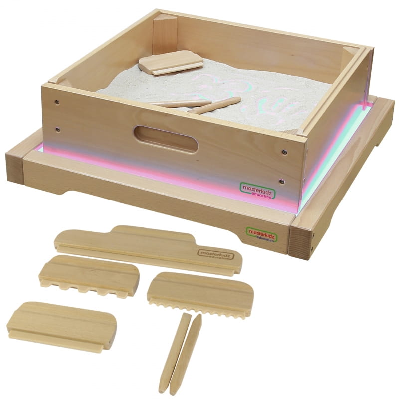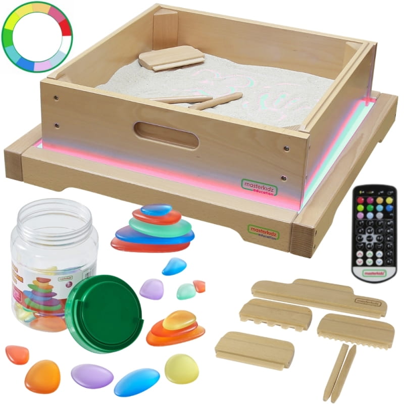 Panel Skrzynia LED Sensoryczna Masterkidz to solidna, drewniana skrzynka z podświetleniem LED emitującym kolorowe światło z możliwością dowolnej konfiguracji dzięki dołączonemu pilotowi, użytkownik może ustawić panel na jeden z 11 zaprogramowanych kolorów, lub ręcznie zmienić emitowany kolor bazując na podstawowych barwach światła: czerwonej, zielonej i niebieskiej. Urządzenie pozwala także na płynne przechodzenie pomiędzy kolorami oraz zapamiętywanie wybranych barw do ponownego użycia. Panel świetlny LED umożliwia różnorodne aktywności wspierające rozwój kreatywności, takie jak mieszanie kolorów czy nauka poprzez system STEM. Efektowne rezultaty uzyskuje się, gdy światło przenika przez różne materiały – liście, papier, tackę z piaskiem czy przezroczystą wodą. Panel idealnie współgra z dołączoną kwadratową tacką do zabawy piaskiem oraz kolorowymi kamyczkami, które dodatkowo wzbogacają doznania sensoryczne.