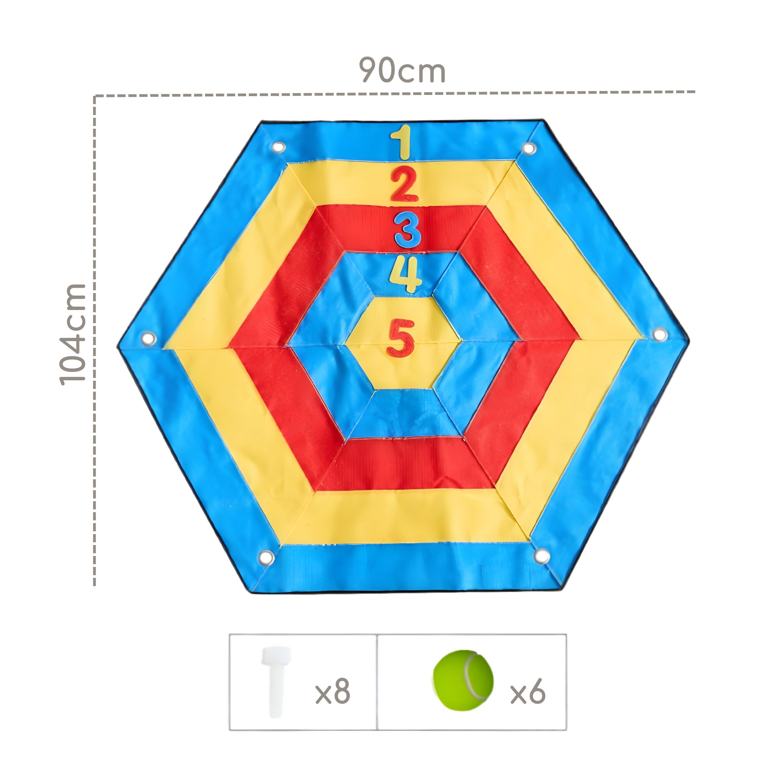 - 1x Gigantyczna sześciokątna tarcza z kolorowymi polami (104 x 90 cm).