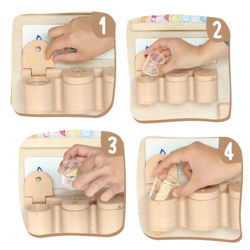 Na dole panelu znajdują się trzy drewniane pojemniczki z plastikowymi tackami. Możesz umieścić w nich ziarna kawy, cynamon czy płatki kwiatów, a następnie prosić dziecko o rozpoznanie aromatu bez patrzenia. To najlepszy trening koncentracji i różnicowania bodźców.