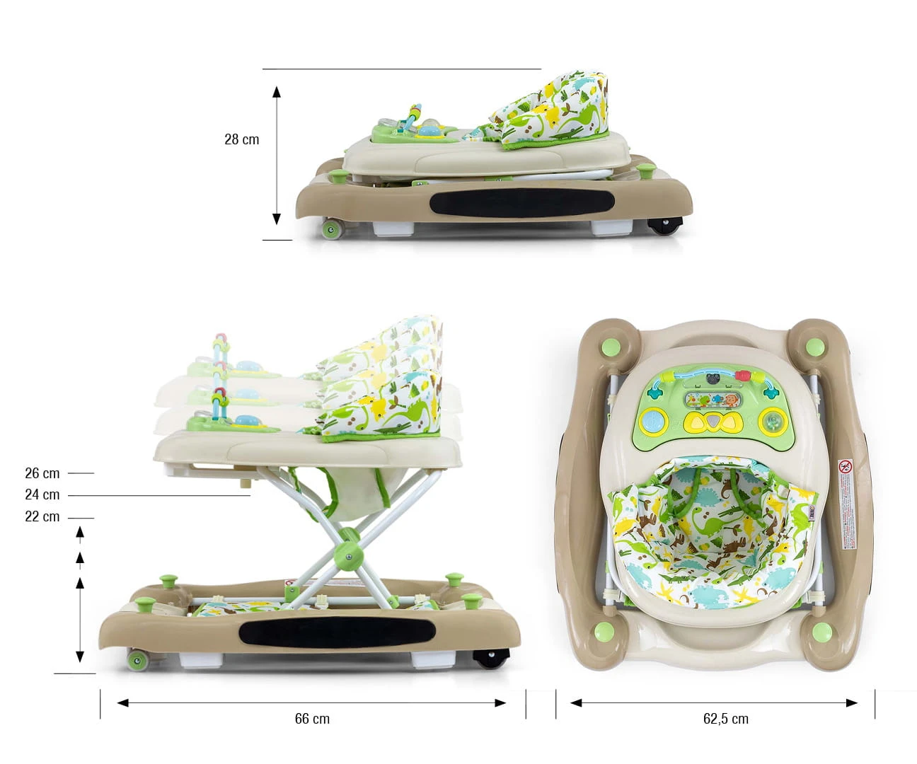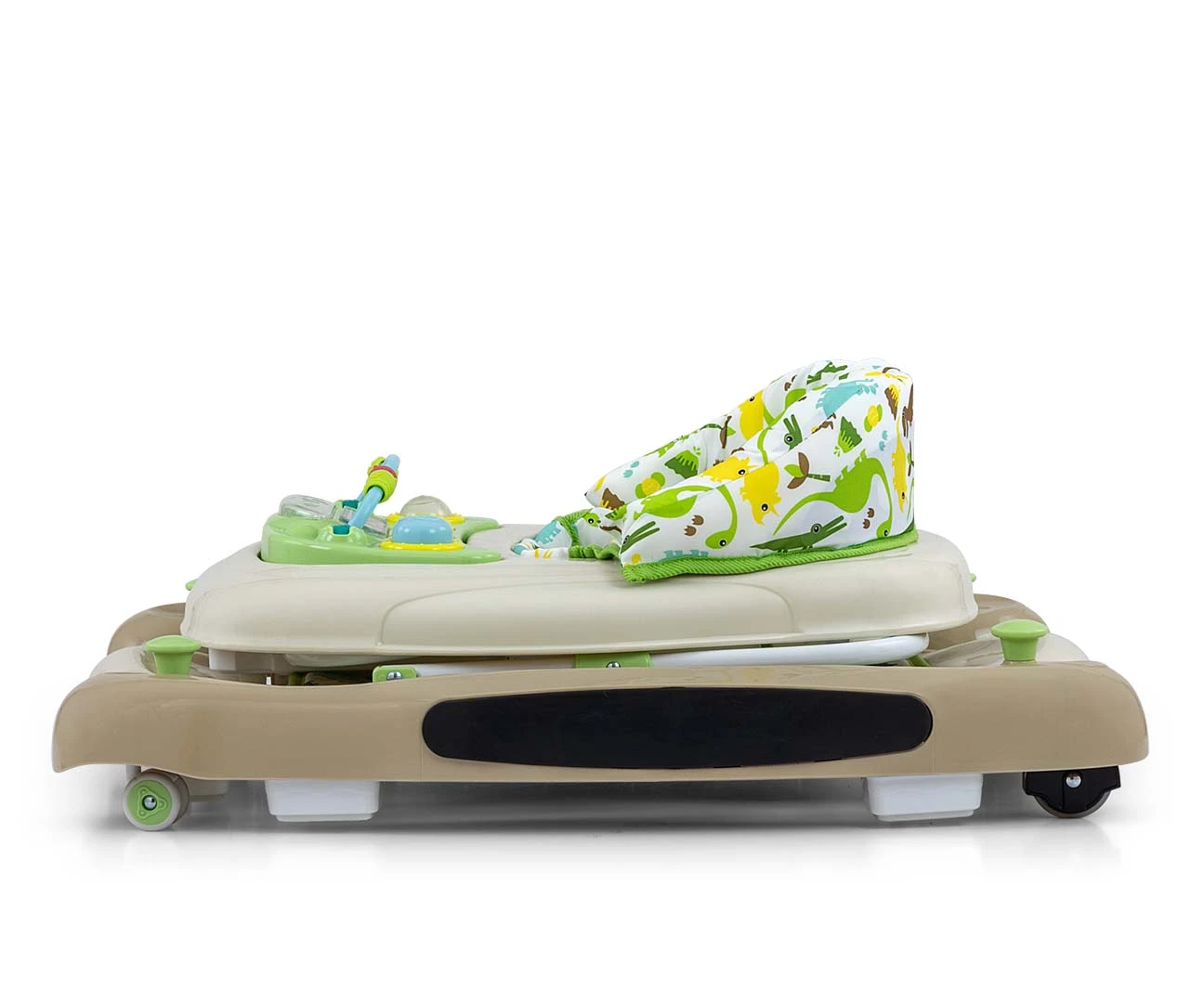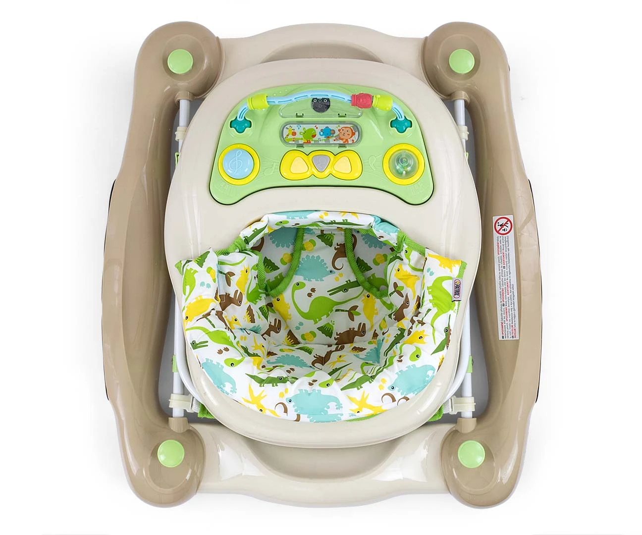 Produkt posiada edukacyjny panel, który zawiera szereg niespodzianek czekających na małych odkrywców: światełka, piszczałki, melodyjki, grzechotka, przyciski i inne ruchome elementy. Po wypięciu panelu z tacki chodzika posłuży on jako niezależna zabawka, np. jako umilacz w podróży a blat przyda się jako stolik do zabaw.