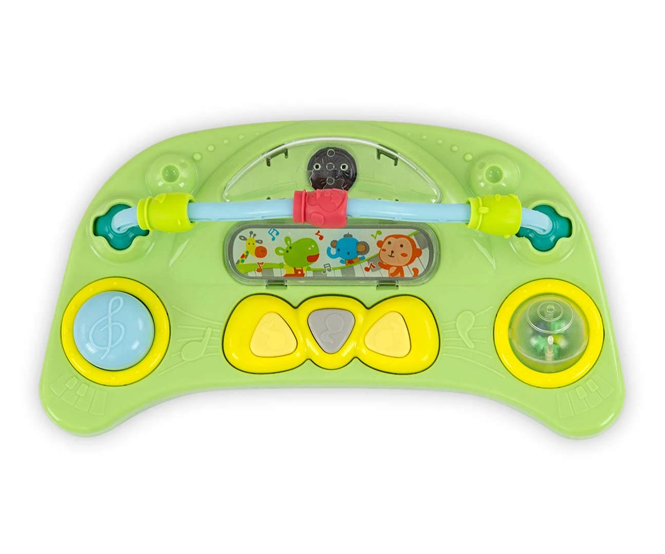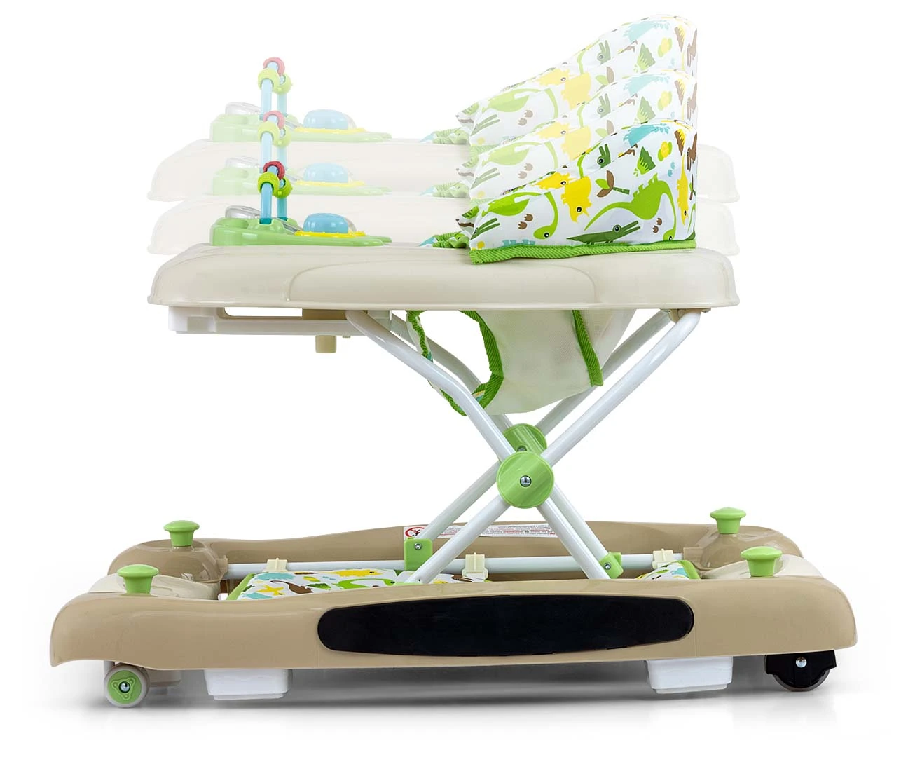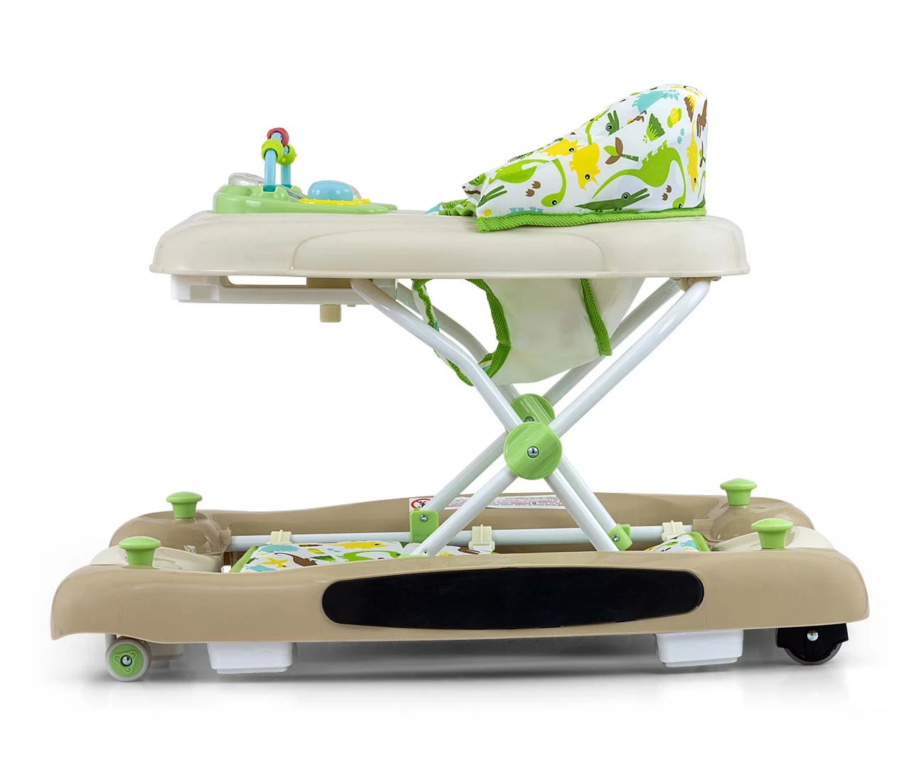 Produkt posiada edukacyjny panel, który zawiera szereg niespodzianek czekających na małych odkrywców: światełka, piszczałki, melodyjki, grzechotka, przyciski i inne ruchome elementy. Po wypięciu panelu z tacki chodzika posłuży on jako niezależna zabawka, np. jako umilacz w podróży a blat przyda się jako stolik do zabaw.
