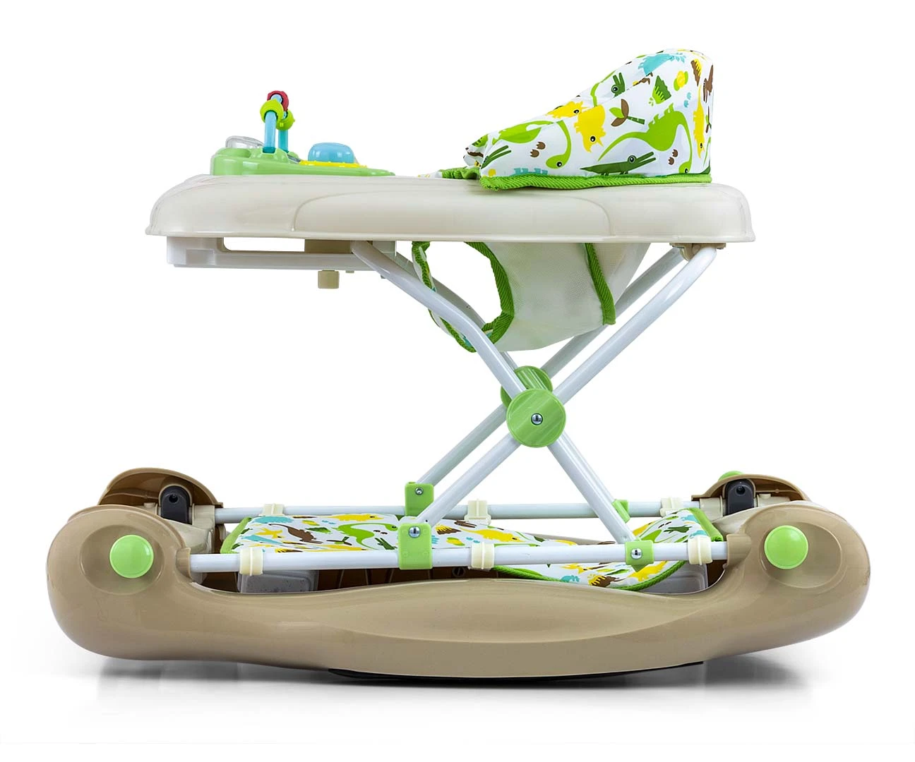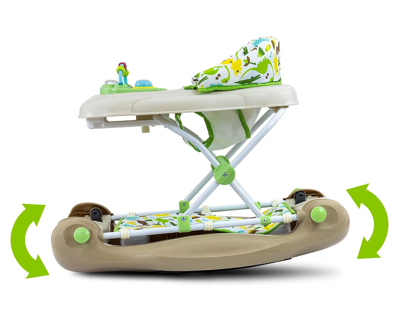 Chodzik Patrol Plus posiada 2 funkcje. Jest to produkt zaprojektowany z myślą o aktywnych i ciekawych świata dzieciach. Pierwsza to funkcja podstawowa jako klasyczny chodzik, druga to funkcja kołysania. Aby wybrać funkcję kołysania w naszym chodziku PATROL Plus należy pociągnąć uchwyty umieszczone po obu stronach płozy, posiadają one nakładki gumowe, a następnie należy ją rozłożyć. W opcji kołysania pod siedziskiem umieszczamy wytrzymały materiał z zaczepami jako osłonę dla zabezpieczenia dziecka.