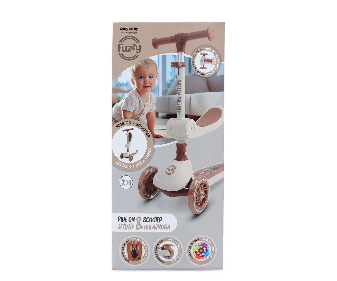 Posiada dwa silikonowe świecące kółka z przodu, które zapewniają stabilność i równowagę. Antypoślizgowy podest i hamulec tylnego koła zaś zwiększają bezpieczeństwo podczas jazdy. FUZZY wykorzystuje mechanizm balansujący, co oznacza, że dziecko musi balansować ciałem, aby skręcać. Regulowana kierownica pozwala na dłuższe użytkowanie hulajnogi wraz z rosnącym użytkownikiem. Kolorowy i atrakcyjny design z pewnością spodoba się dzieciom.