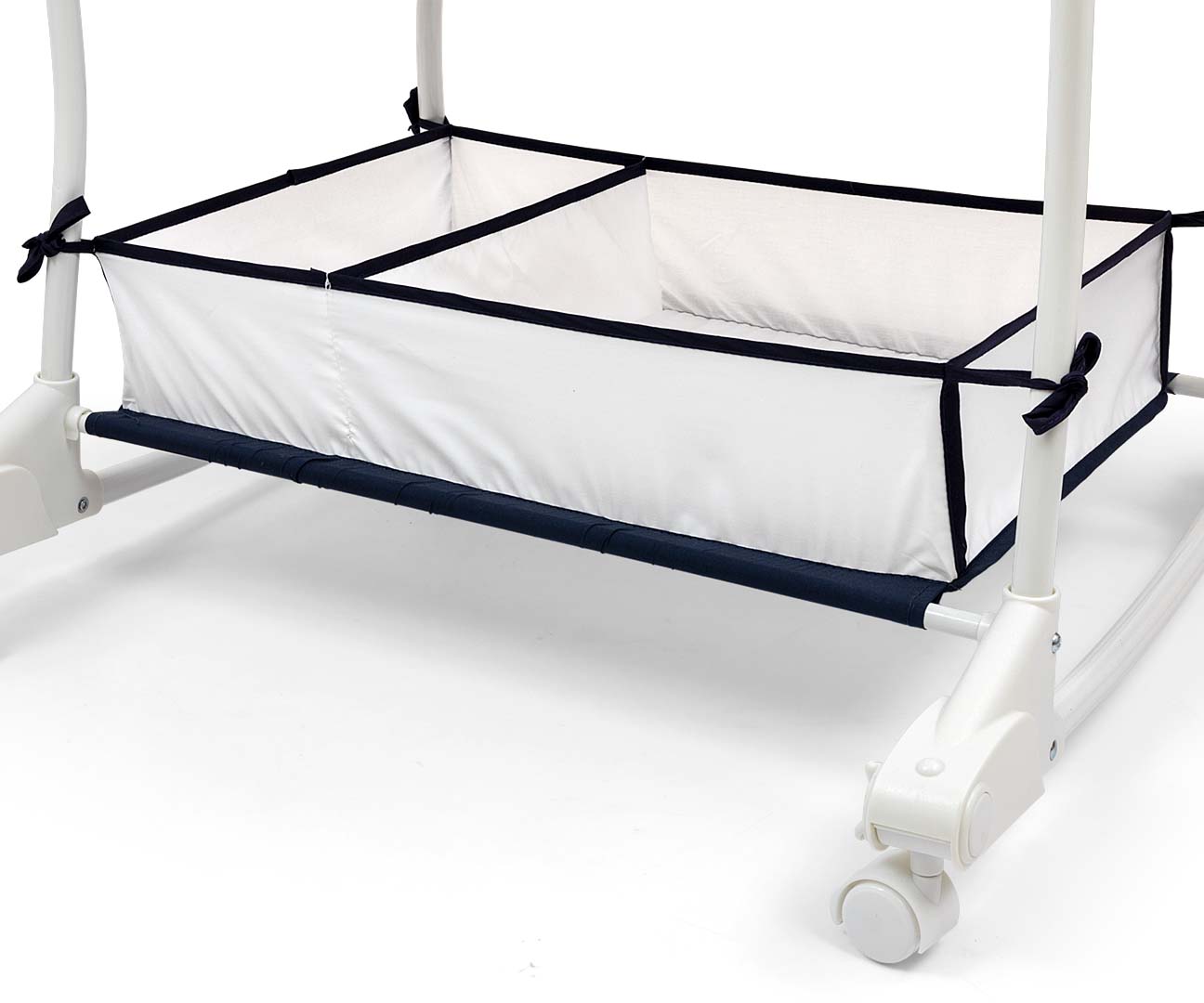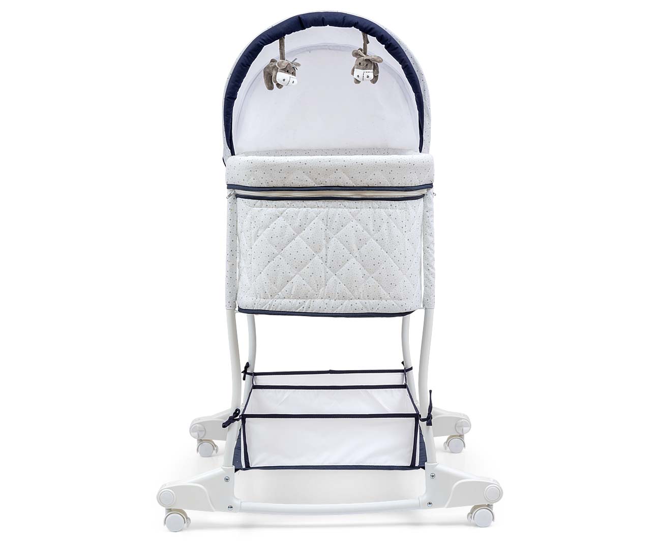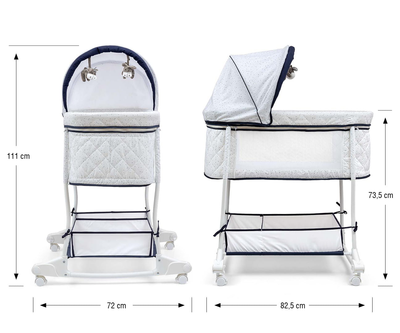 Kołyska – pierwsze łóżeczko wyposażone zostało w praktyczny schowek- koszyk na przybory i akcesoria dziecka umieszczony na dole, posiada 2 komory.