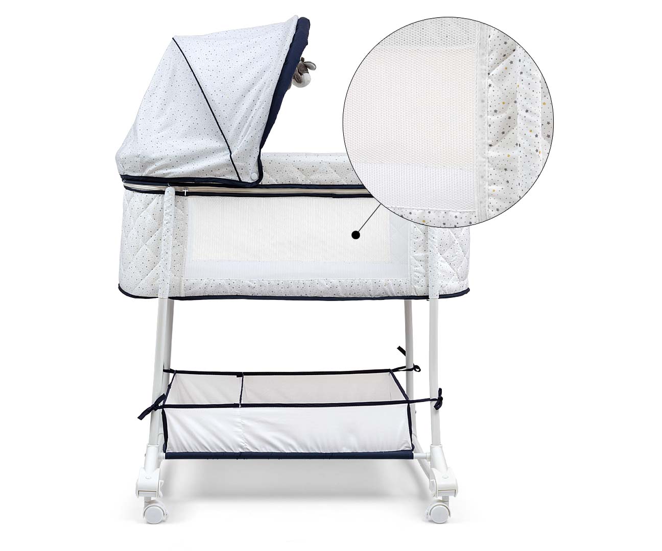 Wysokie boczne ścianki z siatką zapewnią odpowiednią cyrkulację powietrza i umożliwią rodzicowi pełną kontrolę oraz szybką reakcję, gdy dziecko się przebudzi. Dzięki temu, maleństwo szybciej się uspokaja i lepiej śpi.