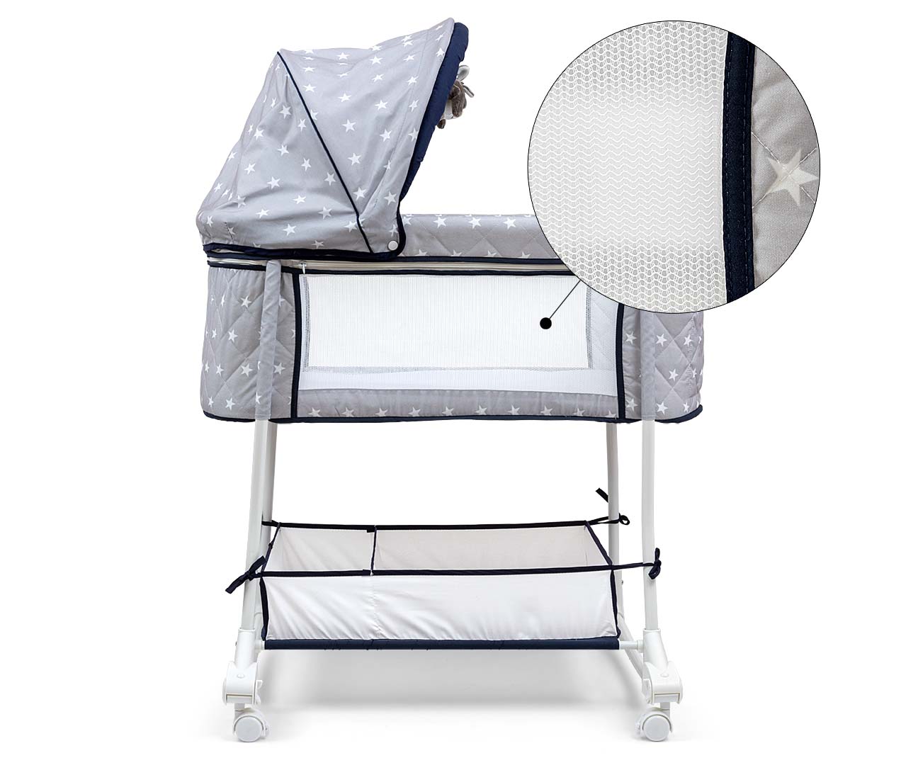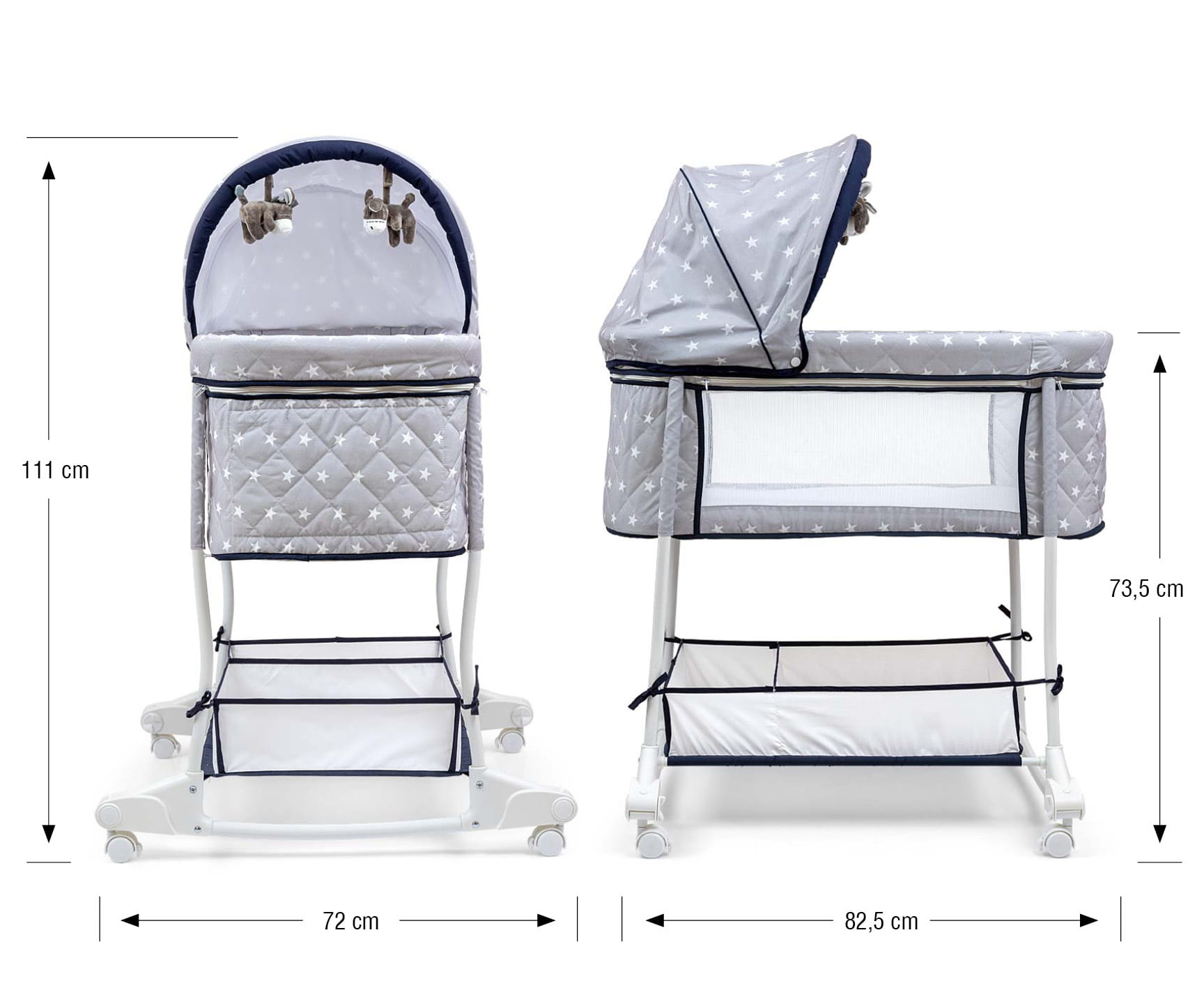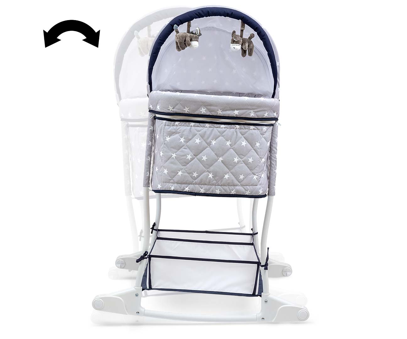 Kołyska – pierwsze łóżeczko wyposażone zostało w praktyczny schowek- koszyk na przybory i akcesoria dziecka umieszczony na dole, posiada 2 komory.
