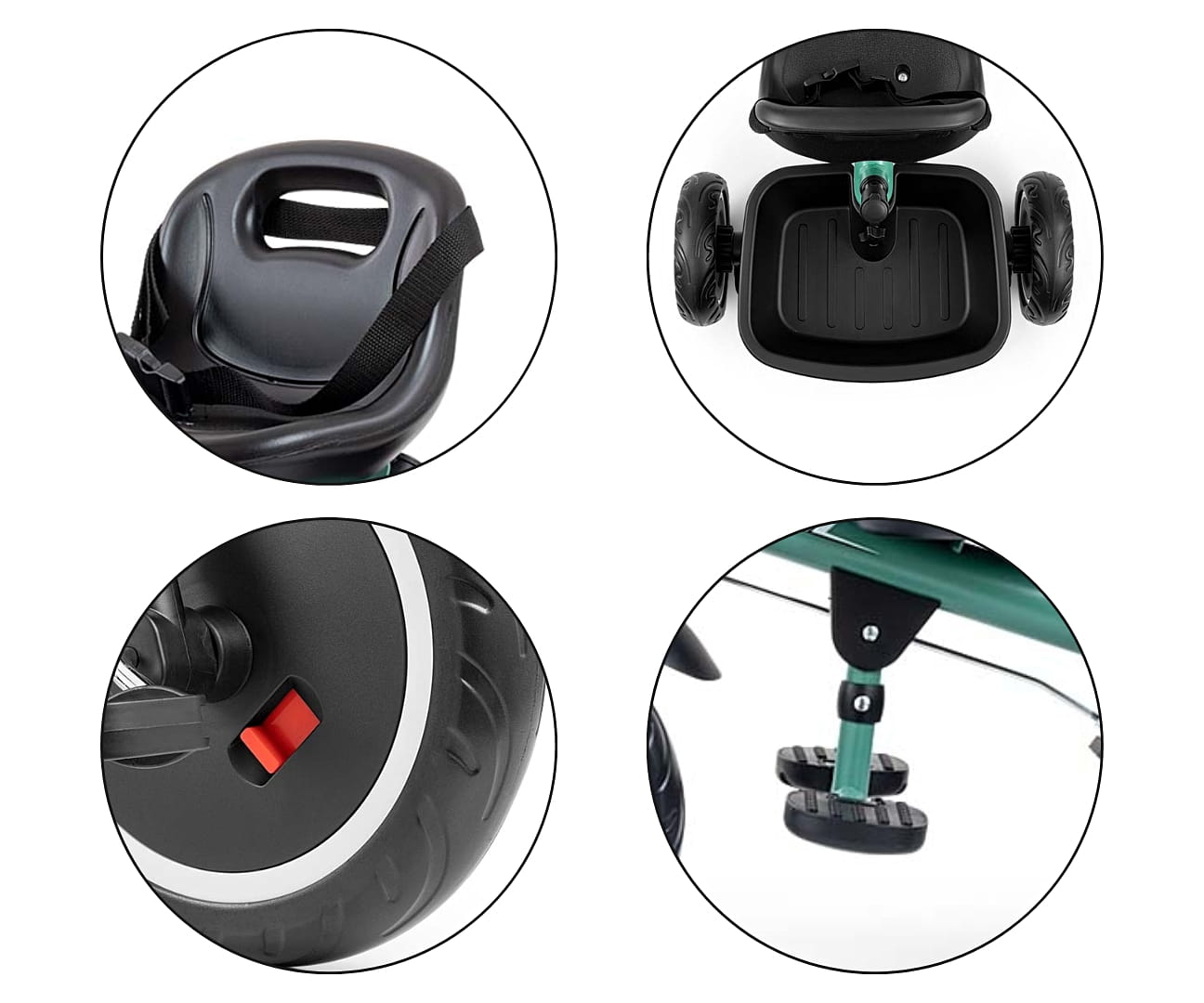 Rowerek został wyposażony w ergonomiczne siedzisko z pasami bezpieczeństwa, regulowaną rączkę do prowadzenia dla rodzica oraz składaną budkę chroniącą przed słońcem i wiatrem. Gumowe, bezobsługowe koła zapewniają płynną jazdę na różnych nawierzchniach, a dodatkowe udogodnienia, takie jak podnóżki i praktyczny koszyk na zabawki, czynią go idealnym towarzyszem codziennych spacerów. To świetny wybór dla maluchów, które uczą się samodzielnej jazdy w komfortowych i bezpiecznych warunkach.