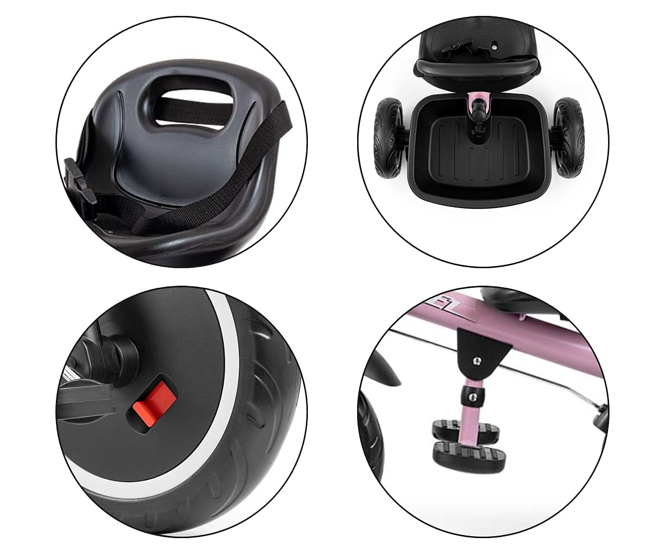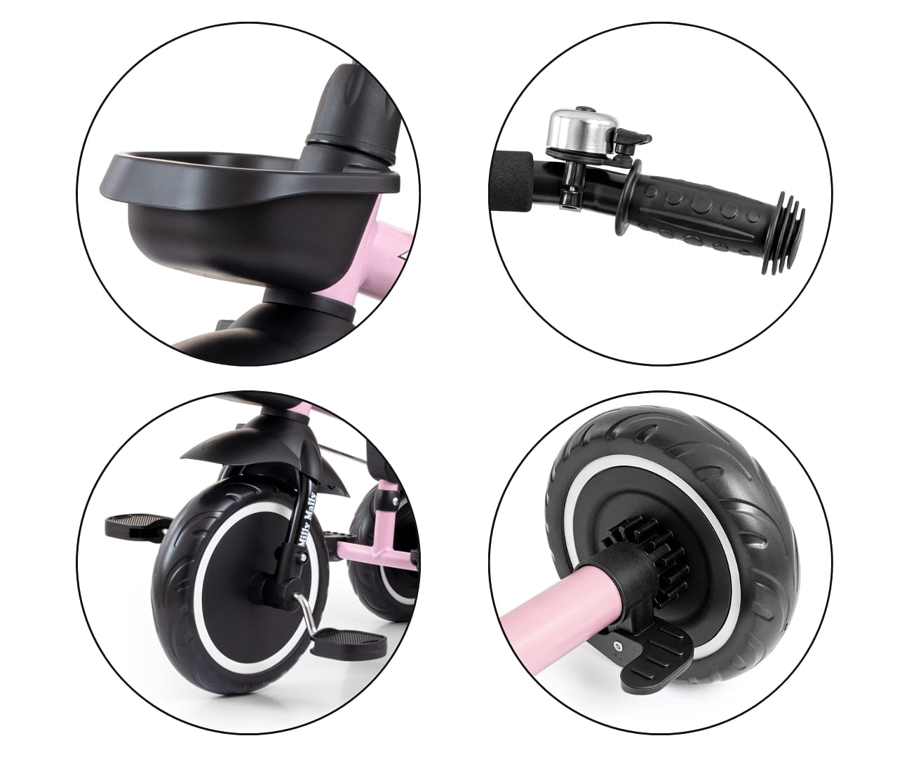 Rowerek został wyposażony w wygodne siedzisko z pasami bezpieczeństwa, regulowaną rączkę do prowadzenia oraz składaną budkę chroniącą przed słońcem i wiatrem. Gumowe koła zapewniają płynną jazdę, a dodatkowe funkcje, takie jak podnóżki i pojemnik na zabawki, sprawiają, że każda przejażdżka to czysta przyjemność. To idealny wybór dla dzieci, które rozpoczynają przygodę z rowerkiem i chcą rozwijać koordynację oraz zdolności motoryczne.