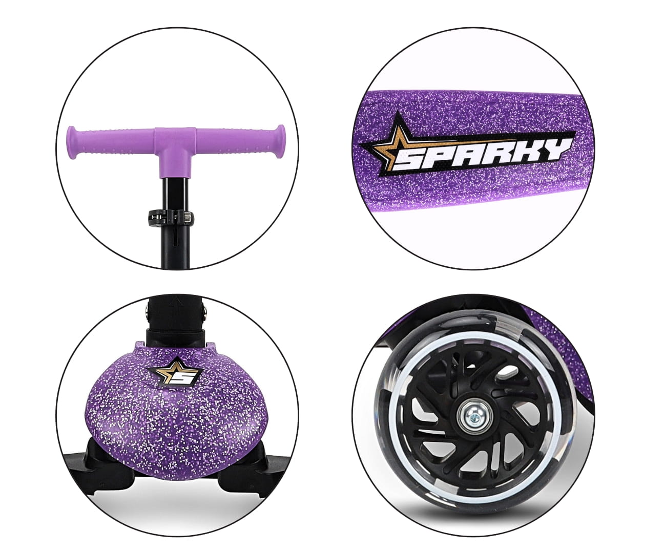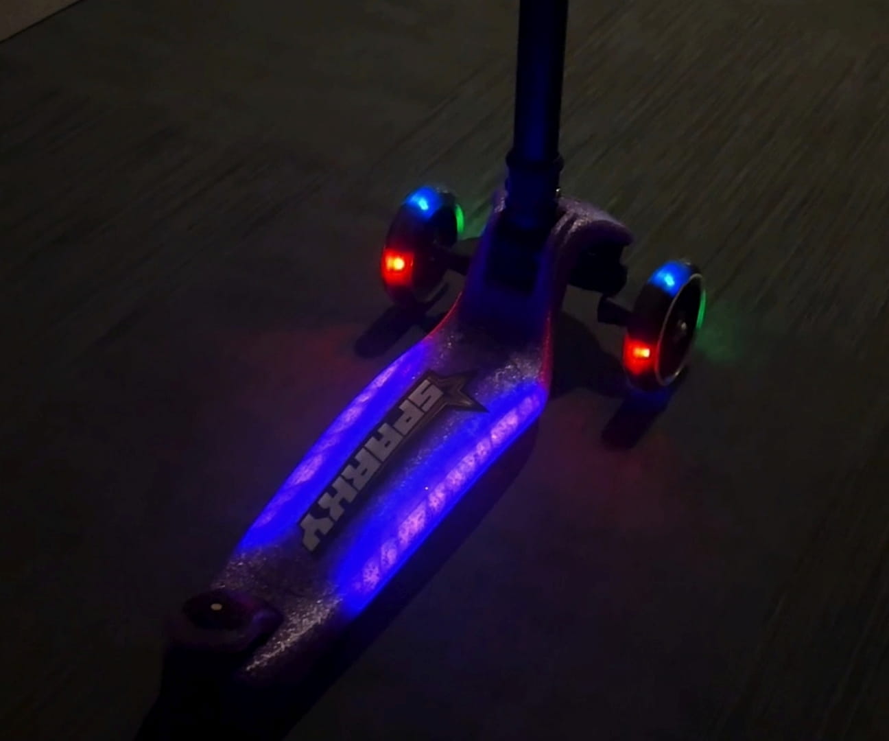 SPARKY zachwyca nie tylko funkcjonalnością, ale i wyglądem! Przednie koła świecą podczas jazdy dzięki wbudowanym diodom LED, a dodatkowe podświetlenie podestu wzdłużne linie po bokach czyni każdą przejażdżkę jeszcze bardziej spektakularną/widowiskową. Efektowne brokatowe wykończenie sprawia, że hulajnoga mieni się w słońcu.