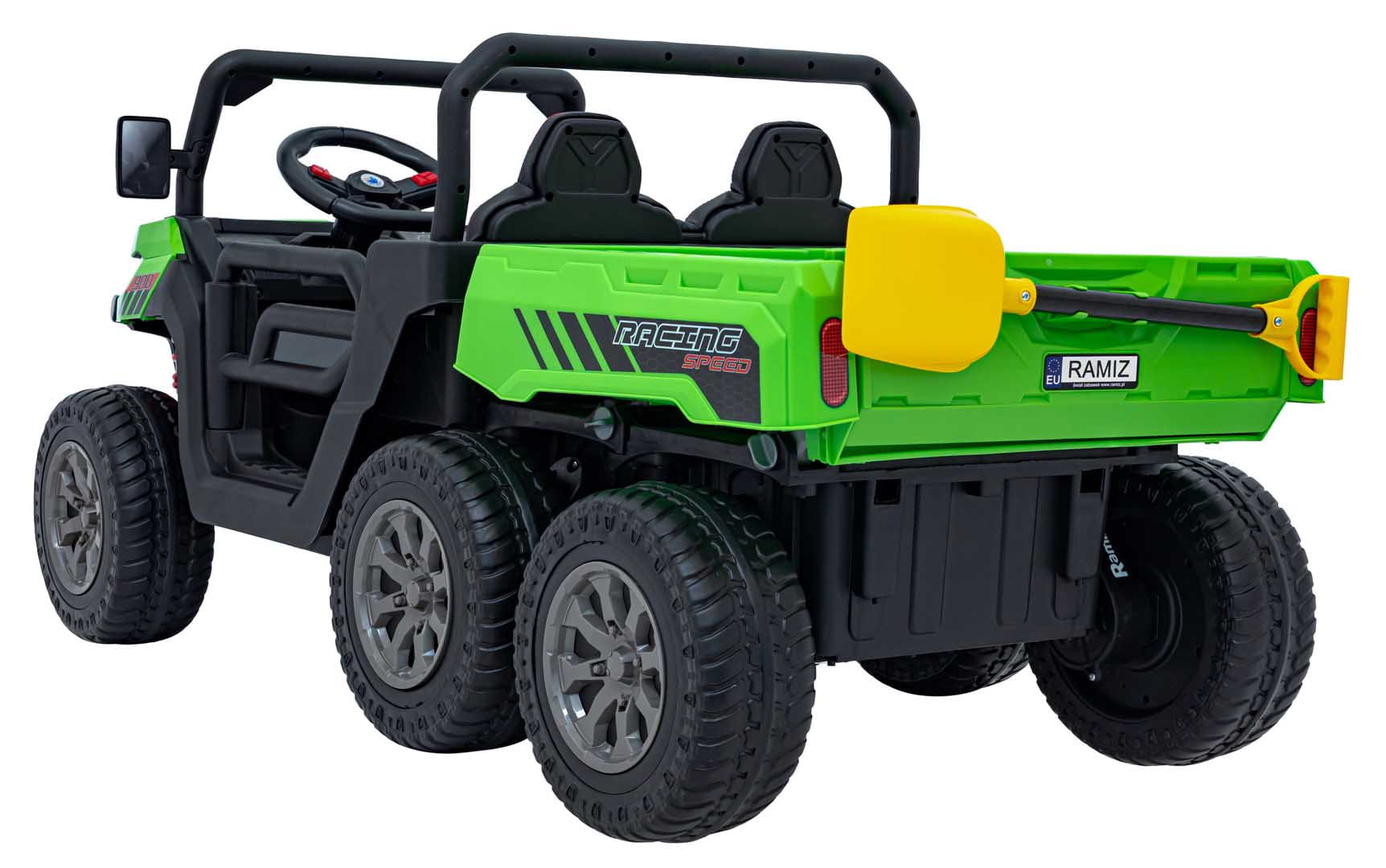 Duży, elektrycznie unoszony kiper z otwieraną tylną burtą (47x50x13 cm) pozwala przewozić zabawki, narzędzia lub inne dziecięce skarby. Dodatkowo, funkcja kołyski uspokaja malucha i pozwala mu się wyciszyć po pełnym wrażeń dniu. W zestawie znajduje się również łopatka, idealna do zabaw w piasku lub ogrodzie.