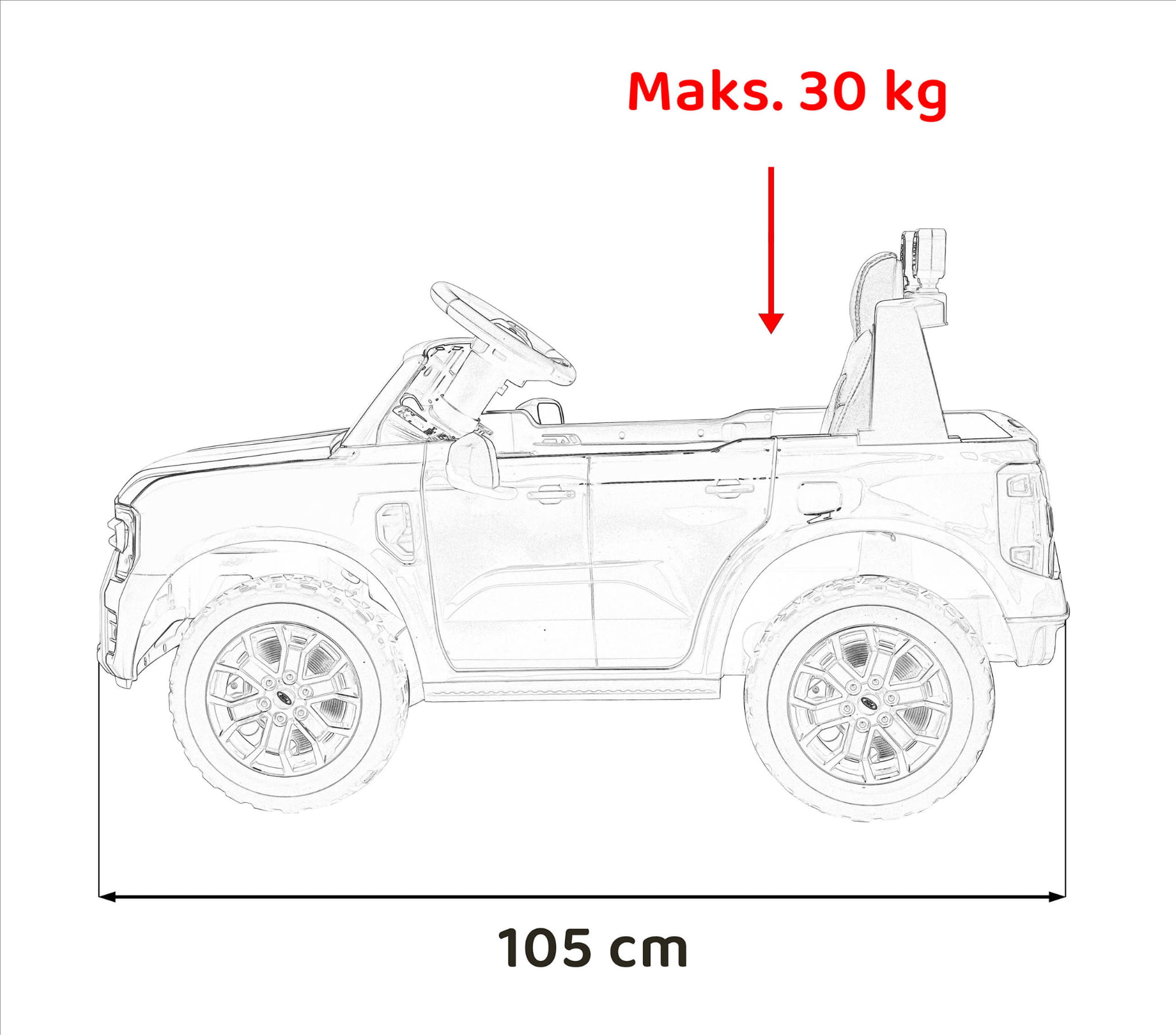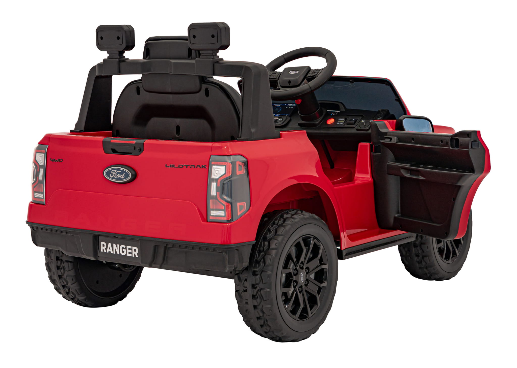Ford Ranger LIFT przyciąga wzrok – ten intensywnie czerwony kolor robi robotę. Ale to nie wszystko. W środku czeka wygodne siedzenie z czarnej ekoskóry, które wygląda luksusowo i jest łatwe do czyszczenia. Otwierane drzwi? Są! Ledowe światła z przodu? Oczywiście. Do tego pojemny bagażnik z tyłu – bo przecież każdy kierowca musi gdzieś wozić swoje skarby (czytaj: klocki, maskotki albo butelkę z wodą).