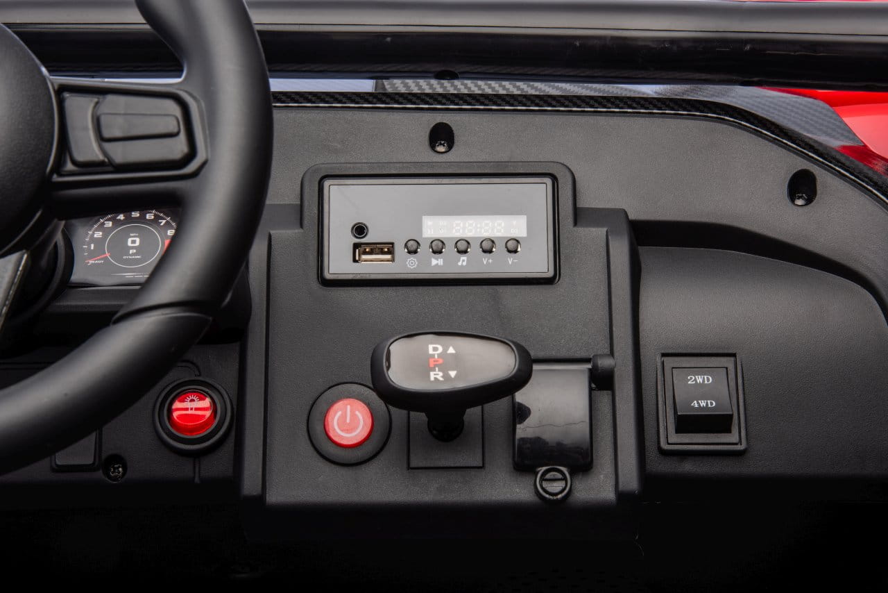Ten pojazd to małe studio muzyczne na kółkach. Wbudowany panel audio obsługuje USB, MP3, AUX, radio FM, a nawet ma wgrane melodyjki. Dzięki przyciskom dźwięków i klaksonu w kierownicy, dzieci mogą udawać prawdziwe manewry drogowe, dodając realizmu każdej przejażdżce.