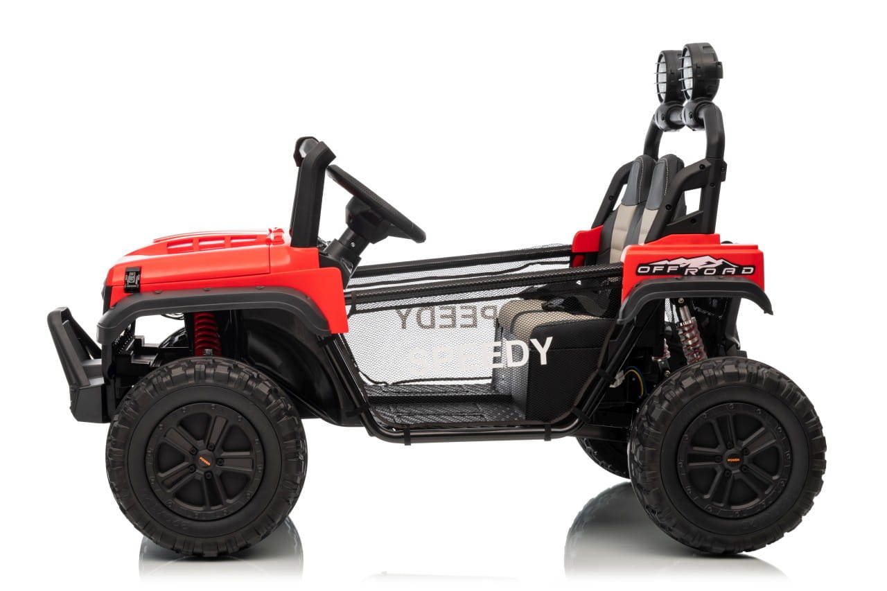 Nasz samochód dla dziecka wyposażony jest w cztery silniki o mocy 200W każdy, co zapewnia wyjątkowe osiągi na każdym terenie. Podwójny akumulator 12V 10Ah (system 24V) gwarantuje długie godziny zabawy bez przerw na ładowanie.