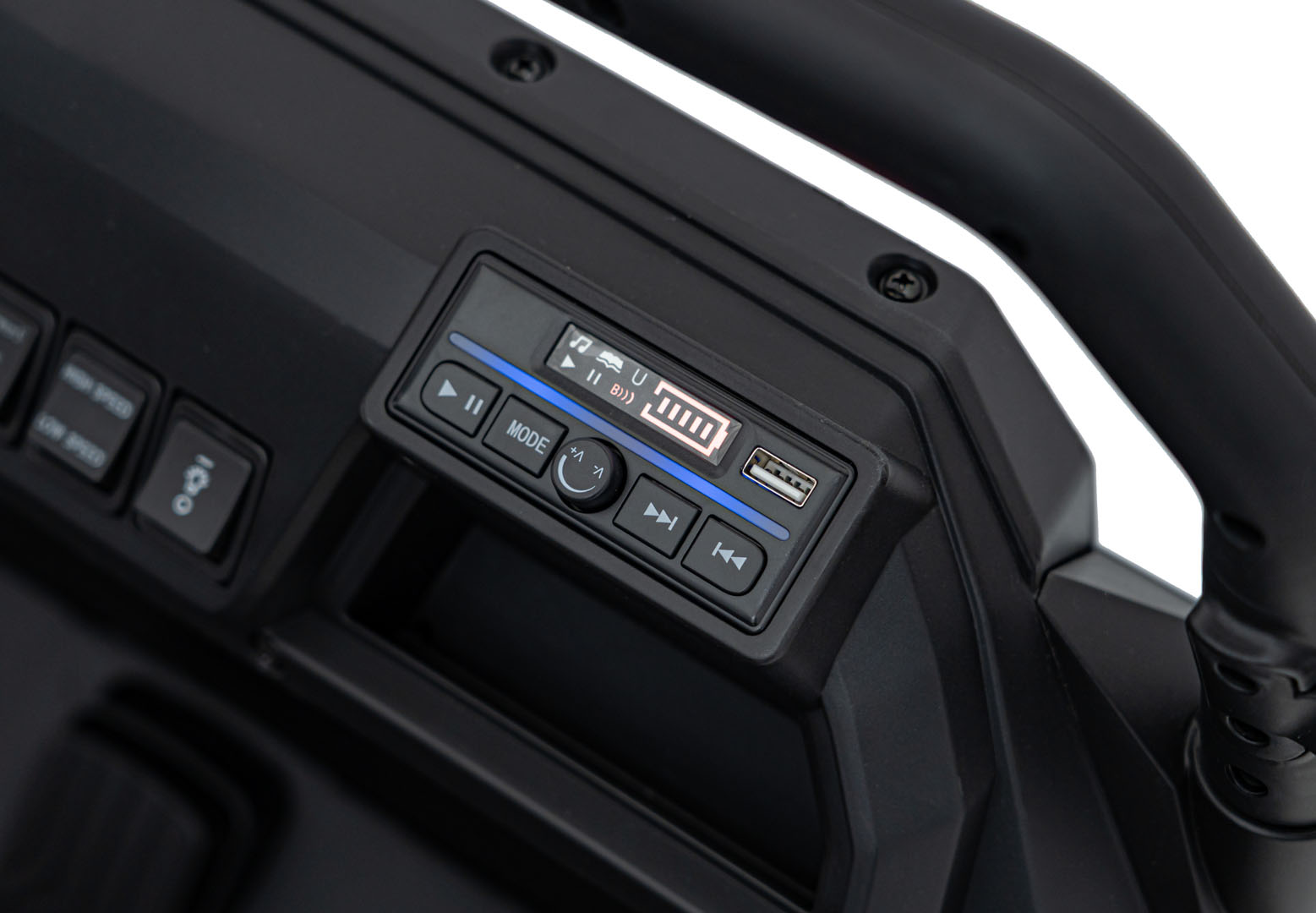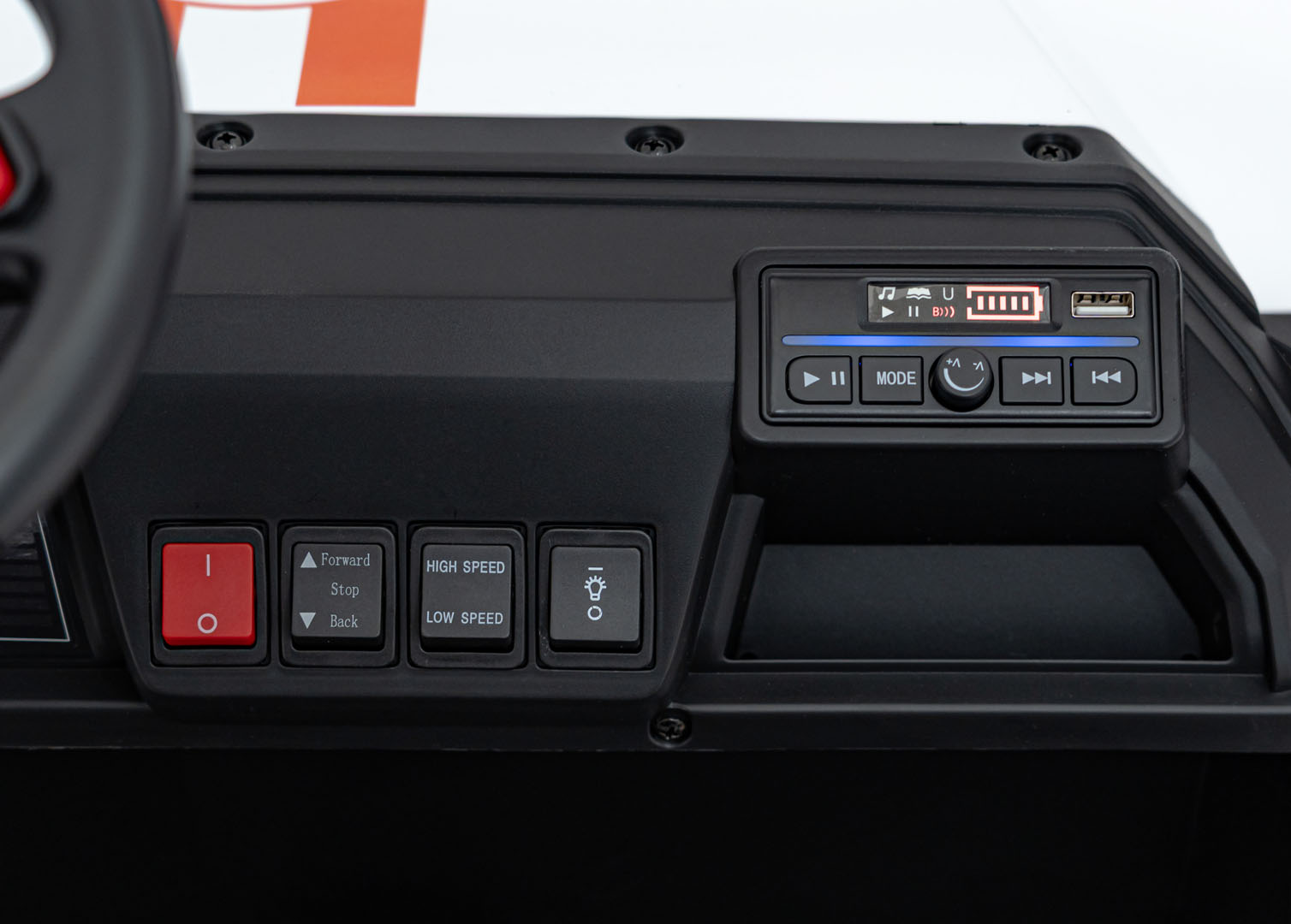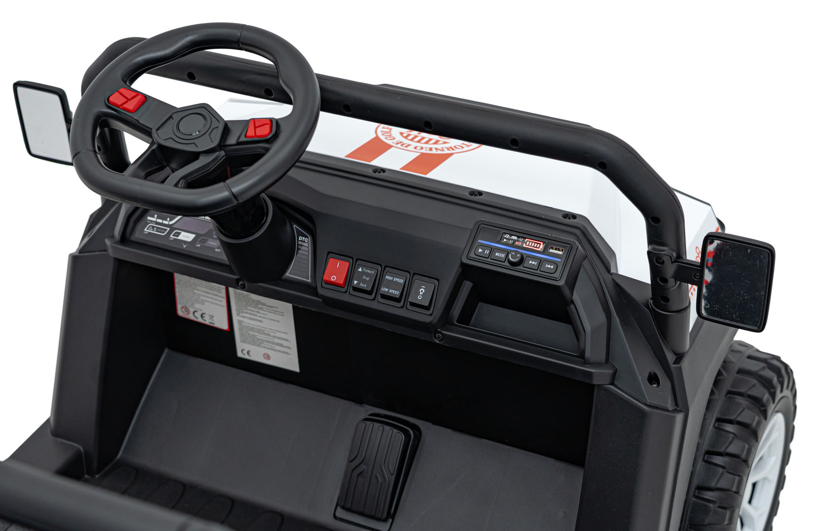 Wewnątrz znajdziesz wszystko, co najlepsze: dwa miękkie fotele z ekoskóry oraz rozbudowany panel audio. Pojazd na akumulator Pick-Up Champion biały umożliwia połączenie przez Bluetooth, posiada radio FM oraz wejście USB, dzięki czemu ulubiona muzyka może towarzyszyć dzieciom na każdym kilometrze.