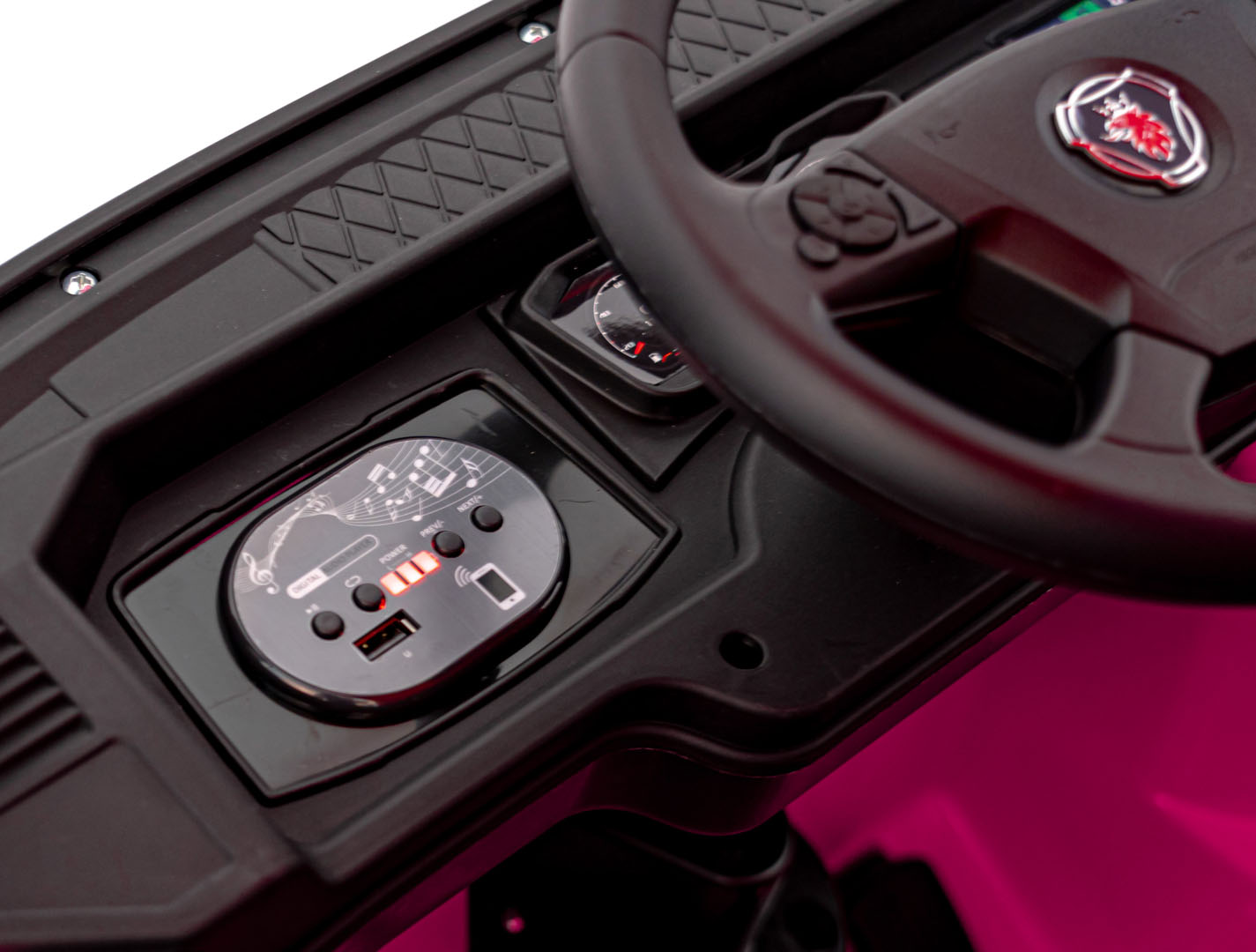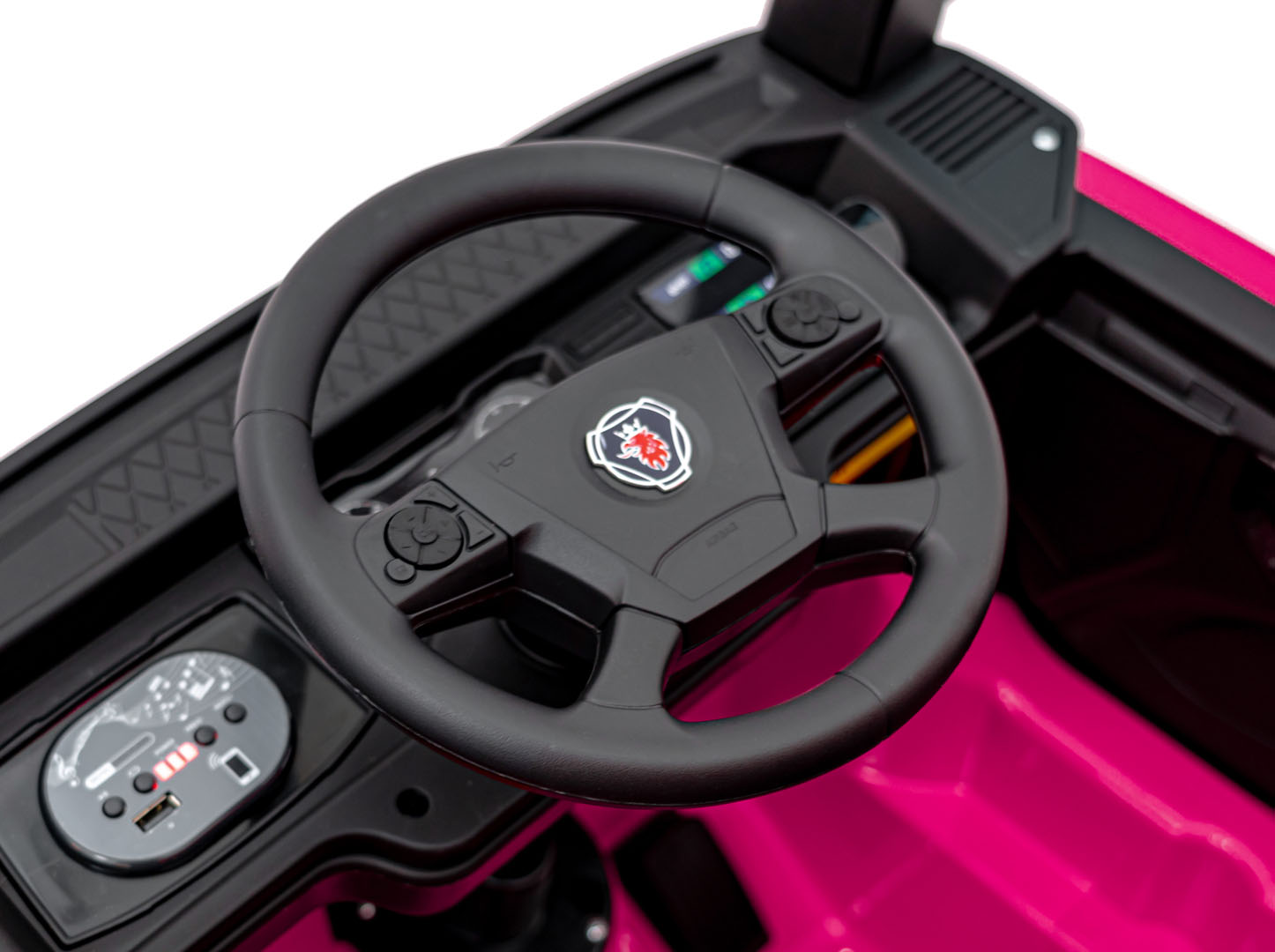 Zabawa staje się jeszcze lepsza dzięki panelowi audio. Pojazd Scania R-SERIE na akumulator pozwala na odtwarzanie ulubionej muzyki przez Bluetooth lub USB, a efekty dźwiękowe w kierownicy sprawiają, że dziecko czuje się jak w prawdziwej kabinie ciężarówki.