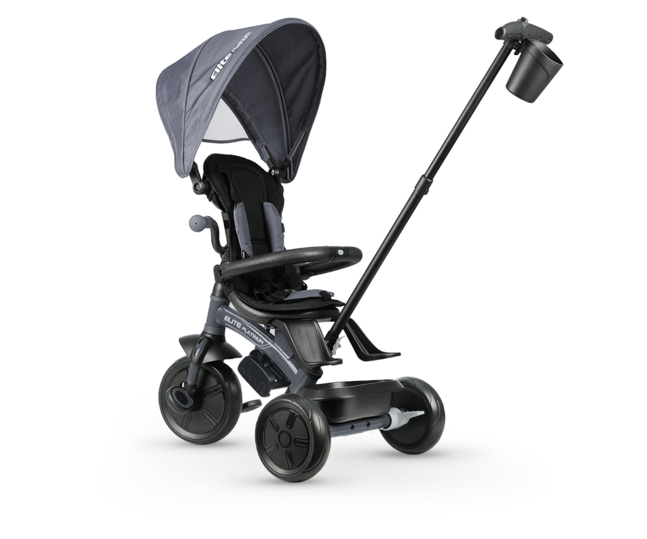 Rowerek ELITE PLATINUM jest stabilny i bezpieczny, posiada nowoczesną konstrukcję i wygodne wyprofilowane siedzisko. Rowerek został wyposażony w barierkę zabezpieczająca dziecko przed wypadnięciem, pięciopunktowe pasy bezpieczeństwa oraz podnóżek, a piankowe koła umożliwiają cichą i komfortową jazdę. Po zdemontowaniu rączki, barierek, budki i pokrowca na siedzisko ELITE PLATINUM będzie służył jako rowerek trójkołowy. Dzięki funkcji „wolnego koła” dziecko może swobodnie pedałować i skręcać, a rączka dla rodzica nadal może korygować prędkość i kierunek przemieszczania.
