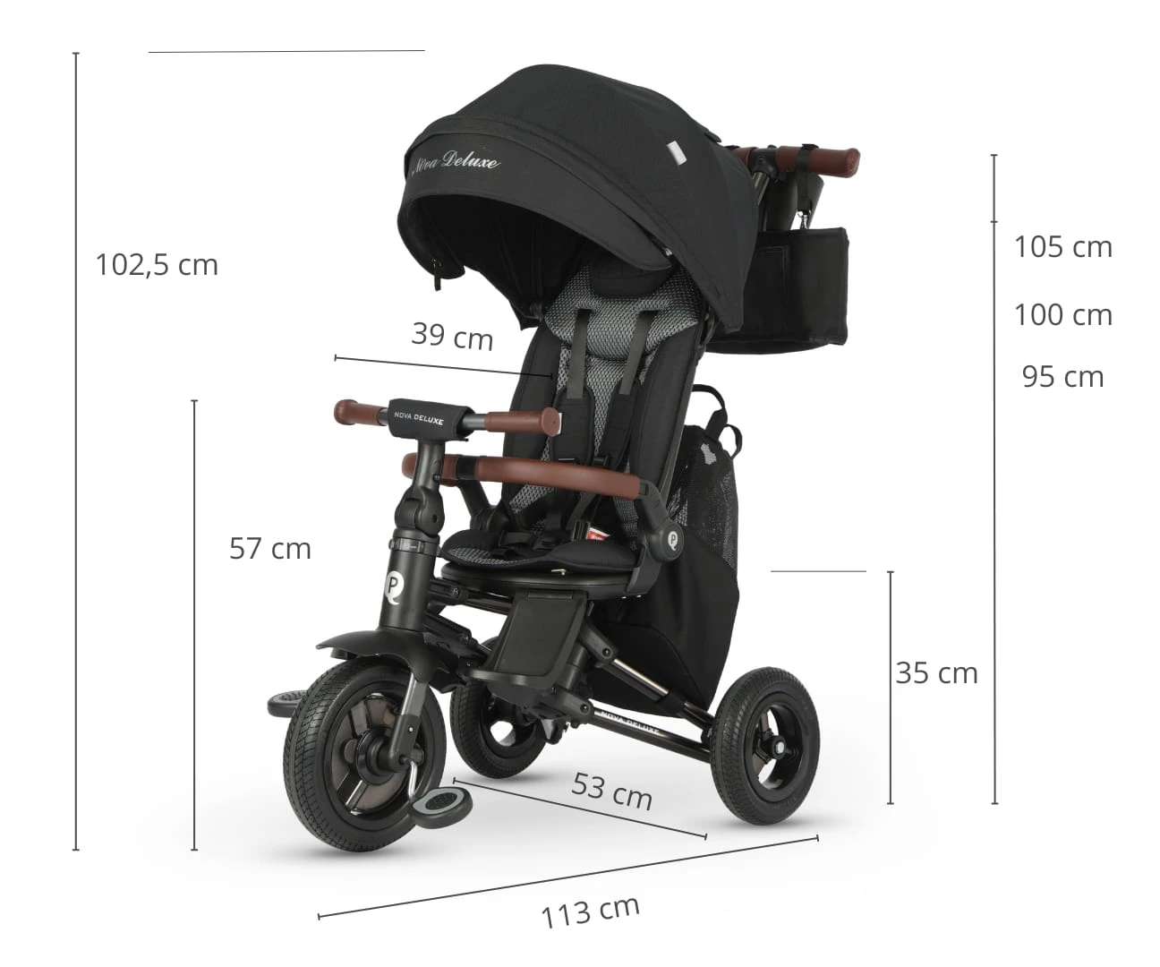 Rowerek ten z pewnością zadowoli najbardziej wymagające gusty, firma QPLAY zastosowała najnowsze trendy w kolorystyce i stworzyła trójkołowca z ramą z efektownym skórzanym wykończeniem oraz dla podkreślenia design zastosowane zostały wszywki z logo i nazwą na budce oraz torbie. Wszystko dla zwiększenia jego atrakcyjności. Gumowe bezdętkowe kółka zapewniają komfort jazdy. Funkcje wolnego koła oraz wolnej kierownicy dają rodzicowi kontrolę aby spokojnie podążać wyznaczoną trasą. Skórzane wykończenia. Ręcznie szyty pałąk oraz uchwyt do prowadzenia pokryte miękką ekoskórą zapewniają wygodę i elegancki wygląd. Wykładany z daszka budki na barierki specjalny dodatkowy materiał chroniący/ zasłaniający prze promieniami UV. Oddychająca poduszka o anatomicznym kształcie. Zaprojektowana z myślą o wygodzie i lepszej cyrkulacji powietrza dziecka. Łatwa do złożenia konstrukcja modelu Qplay Nova Deluxe sprawia, że rowerek jest wyjątkowo wygodny w przenoszeniu. Wyposażona jest również w torbę na zakupy, torbę na pieluchy oraz uchwyt na kubek z przegrodą na telefon – idealne miejsce do przechowywania butelek z wodą, zabawek, przekąsek i chusteczek!