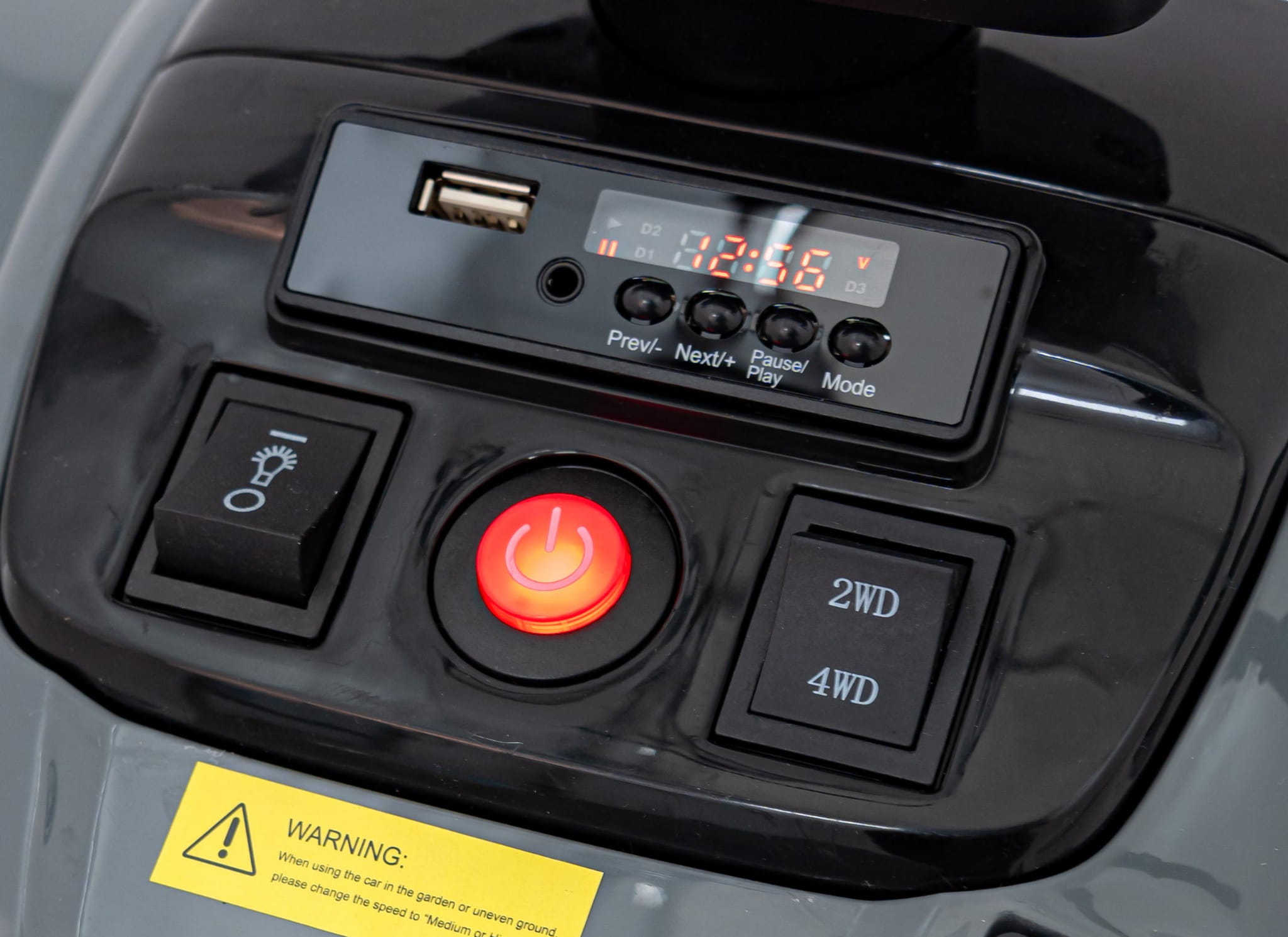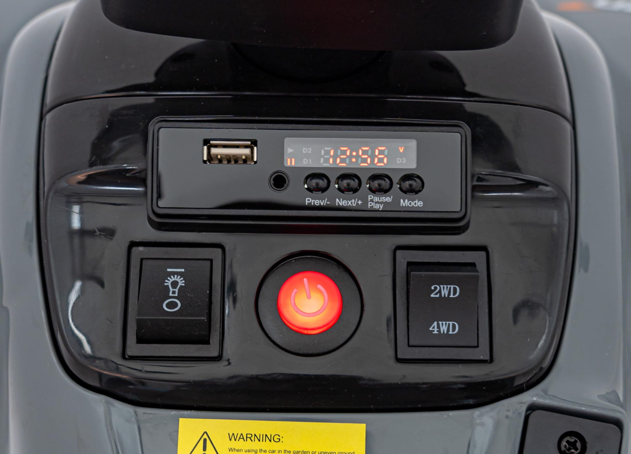 Żadna podróż nie może obyć się bez muzyki! Wbudowany panel audio MP3 z wejściem USB i AUX pozwala odtwarzać ulubione piosenki, a wgrane melodyjki oraz dźwięki klaksonu dodają realizmu zabawie. Przednie światła LED sprawiają, że jeździk wygląda imponująco, zwłaszcza po zmroku, a podświetlany włącznik dodaje mu nowoczesnego charakteru.