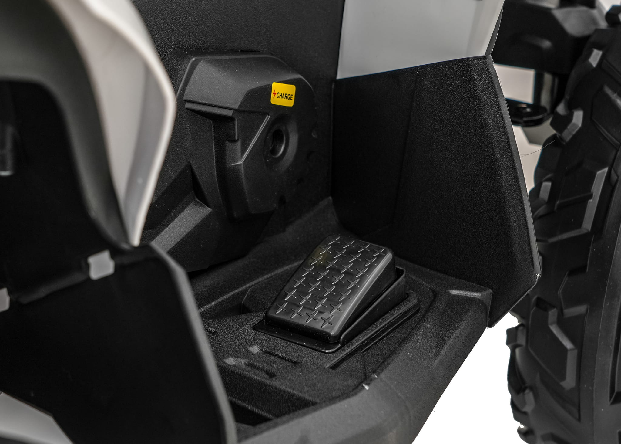 Deska rozdzielcza wyposażona jest w wskaźnik naładowania akumulatora, co pozwala rodzicom i dzieciom łatwo kontrolować poziom energii. Dodatkowe oświetlenie LED z przodu i z tyłu nadaje pojazdowi nowoczesny wygląd i zwiększa jego widoczność podczas jazdy po zmroku.
