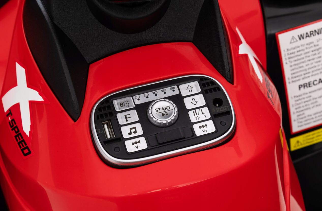 - Prosta obsługa: Quad na akumulator jest łatwy do obsługi – maluch może samodzielnie ruszać i zatrzymywać się dzięki prostemu systemowi pedałów. Wystarczy nacisnąć pedał gazu, aby rozpocząć jazdę, a zwolnić go, by zatrzymać pojazd. Dodatkowo, niektóre modele posiadają przycisk startu, co umożliwia jeszcze łatwiejsze uruchomienie pojazdu.