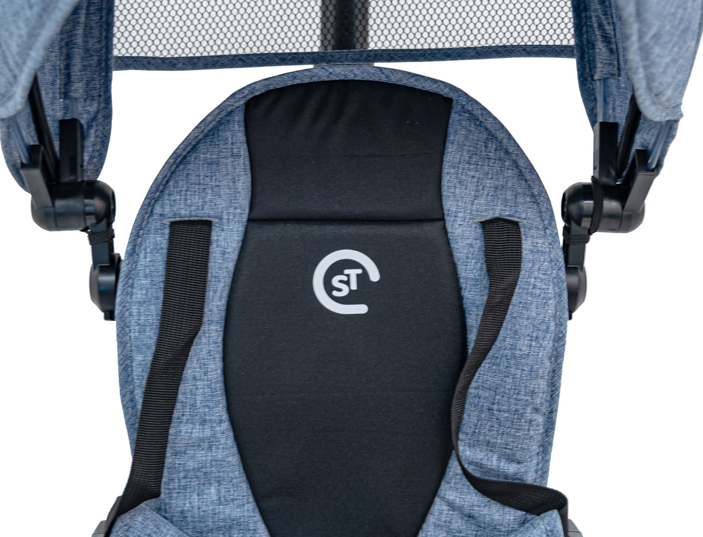 Jedną z kluczowych funkcji modelu RIDER jest obrotowe siedzisko. Wystarczy jeden ruch, aby maluch mógł jechać przodem do rodzica, czując się bezpiecznie lub przodem do kierunku jazdy, by swobodnie obserwować świat. Miękki, niebieski pokrowiec na siedzisku zapewnia wygodę nawet podczas bardzo długich spacerów.