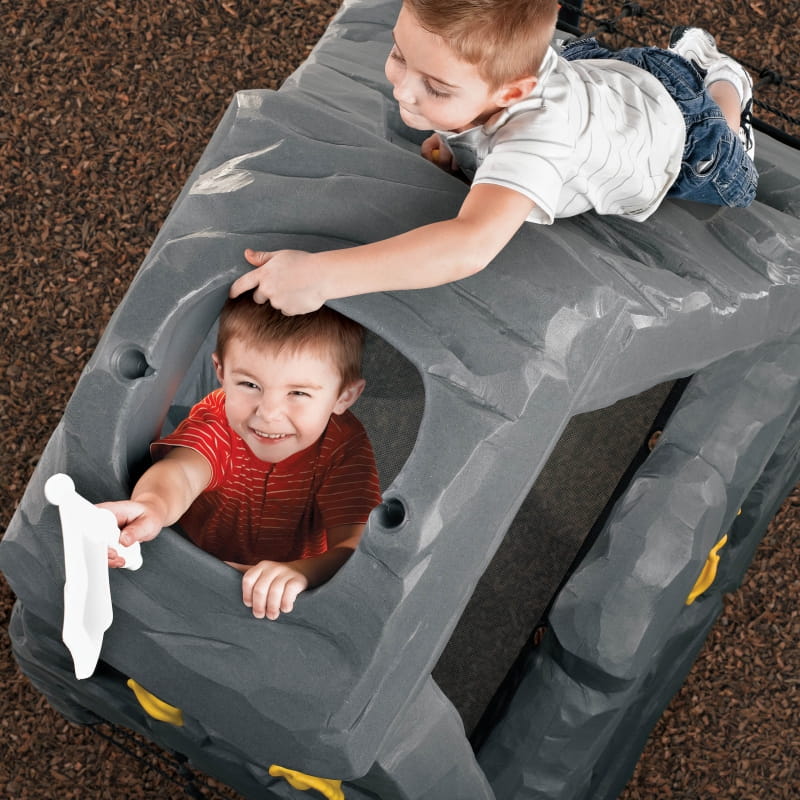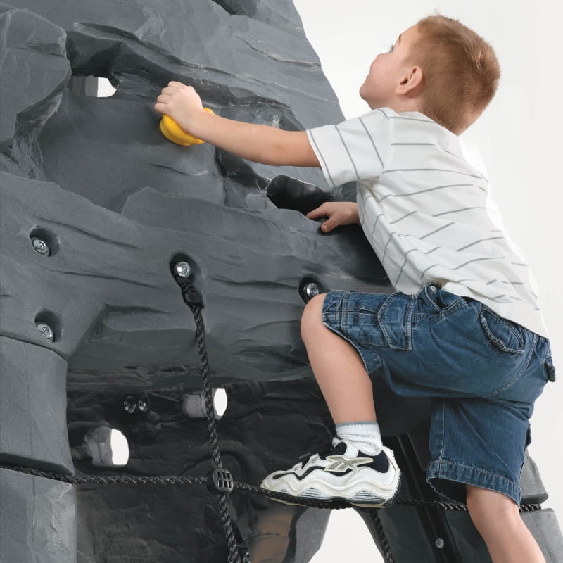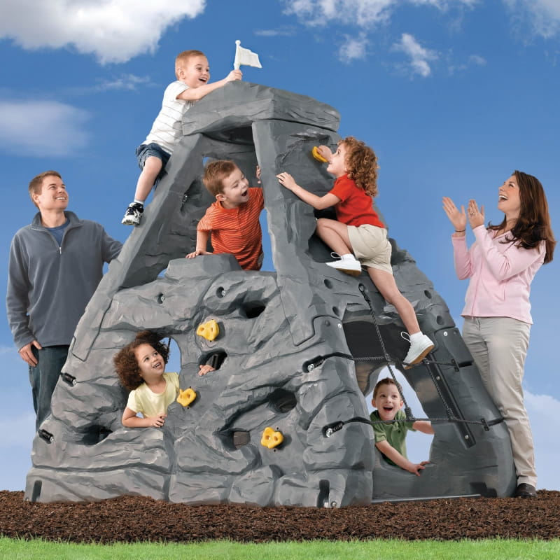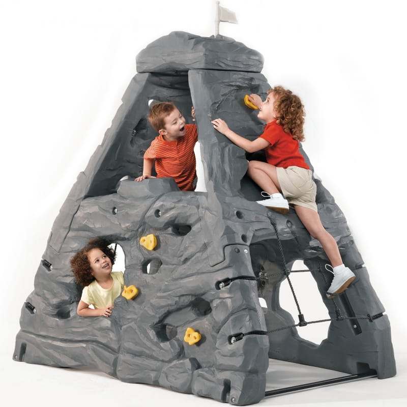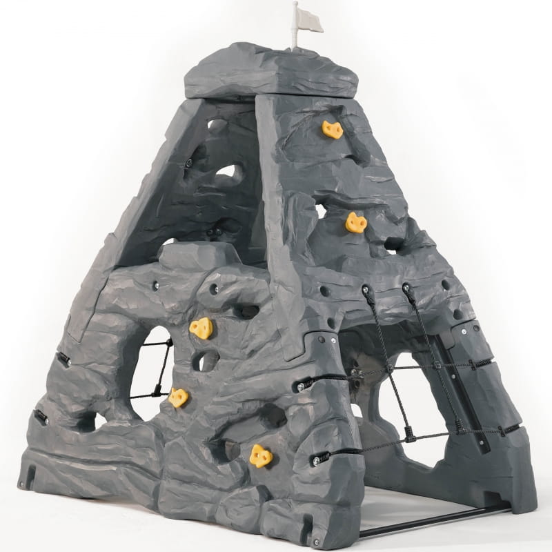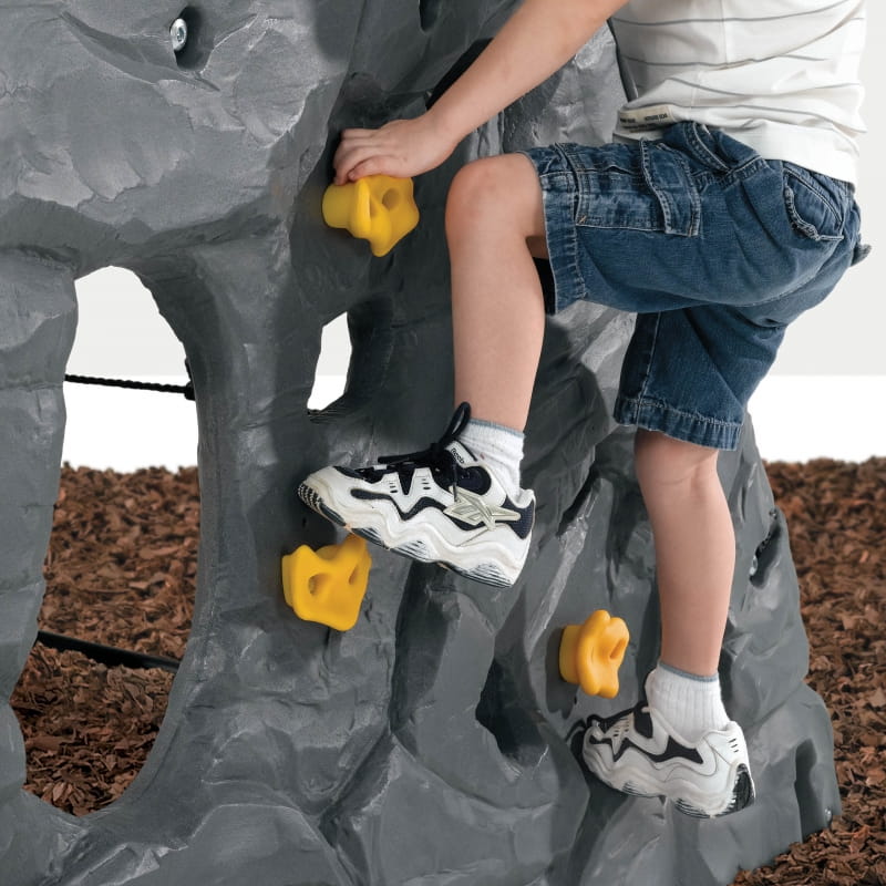 Czterostronna realistyczna ściana skalna ma wysokość 2,03 m, zapewniając dzieciom dużo miejsca do wspinaczki i zabawy. Mali wspinacze mogą ścigać się na szczyt, aby złapać dołączoną flagę, używając uchwytów i siatek ładunkowych, aby się podnieść!