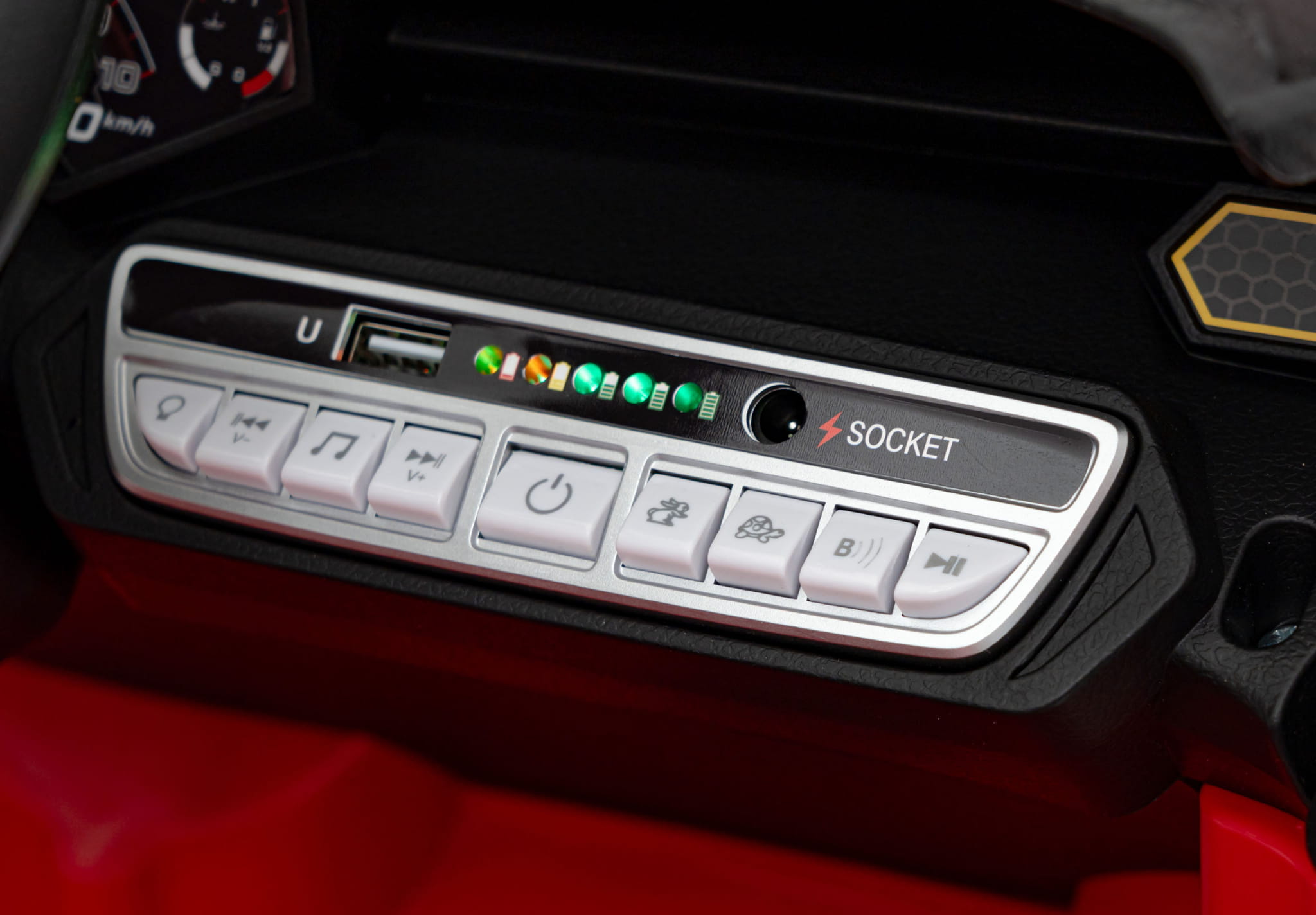 - Funkcje muzyczne: Pojazd wyposażony jest w panel audio z możliwością odtwarzania MP3, wgranymi melodyjkami oraz z wejściem USB i Bluetooth, pozwalając na podłączenie ulubionych utworów. Dodatkowo, przyciski na kierownicy oferują dźwięki klaksonu oraz melodie, które umilą każdą podróż.