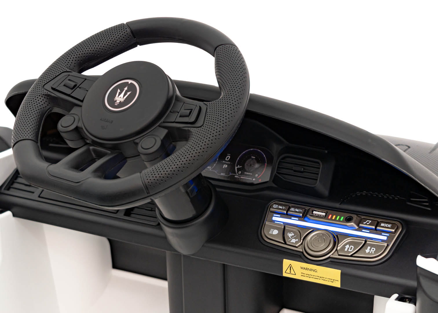 Ten wyjątkowy samochód dla dzieci zachwyca detalami – od odwzorowanej sylwetki sportowego Maserati po eleganckie wykończenie wnętrza. Otwierane drzwi, czarna ekoskóra na siedzeniu i światła LED sprawiają, że zabawa staje się bardziej realistyczna i ekscytująca. To idealne połączenie luksusu i frajdy, które sprawi, że każde dziecko poczuje się wyjątkowo.