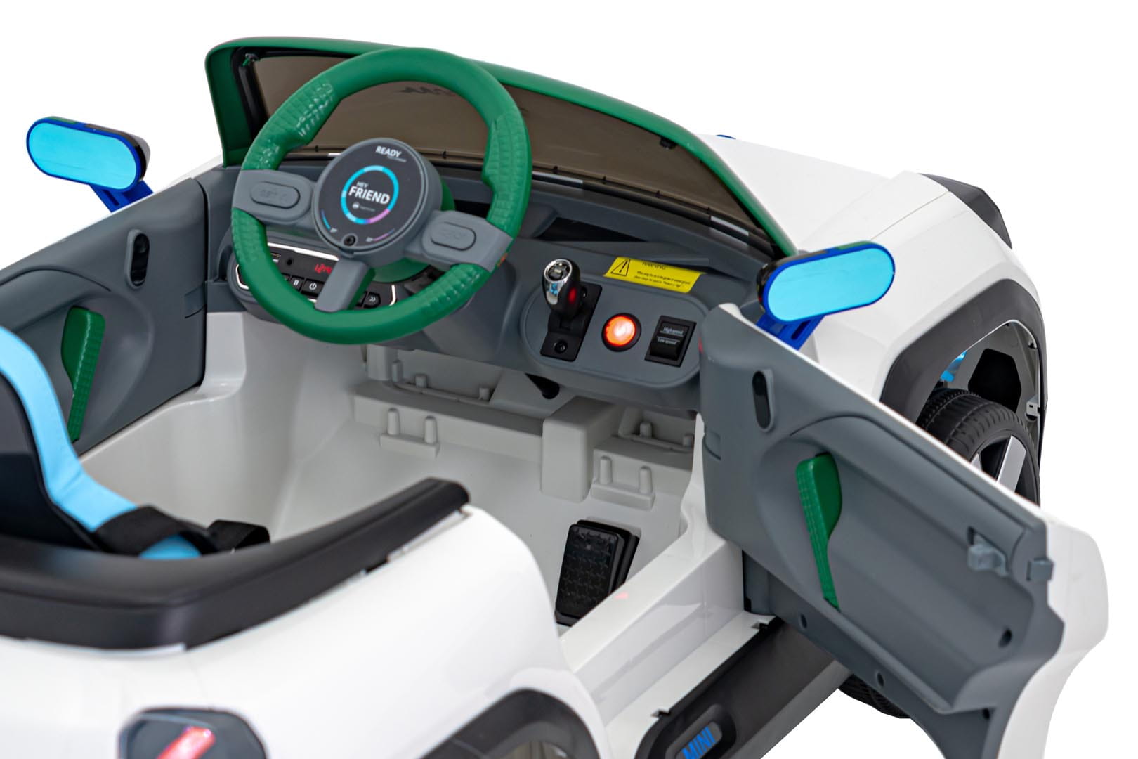 Siedzenie z czarnej ekoskóry z wytłoczeniami MINI gwarantuje komfort podczas jazdy. Otwierane drzwi ułatwiają wsiadanie i wysiadanie, a pasy bezpieczeństwa oraz pilot z przyciskiem STOP dają rodzicom pełną kontrolę nad pojazdem.