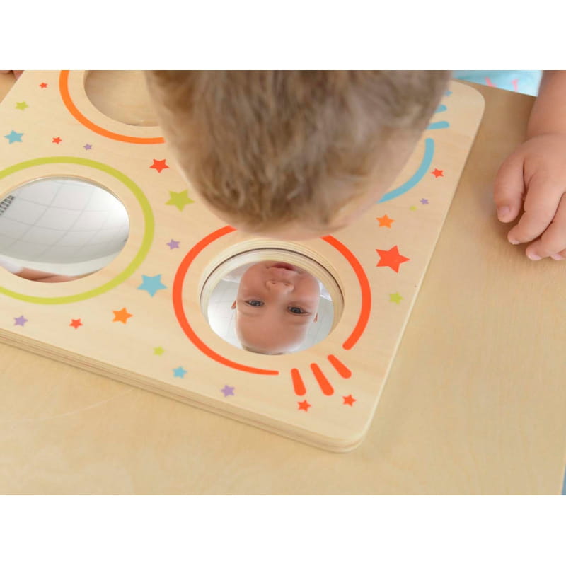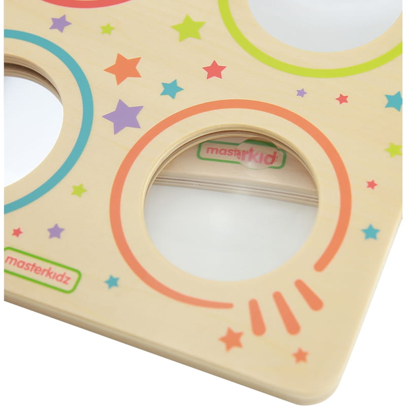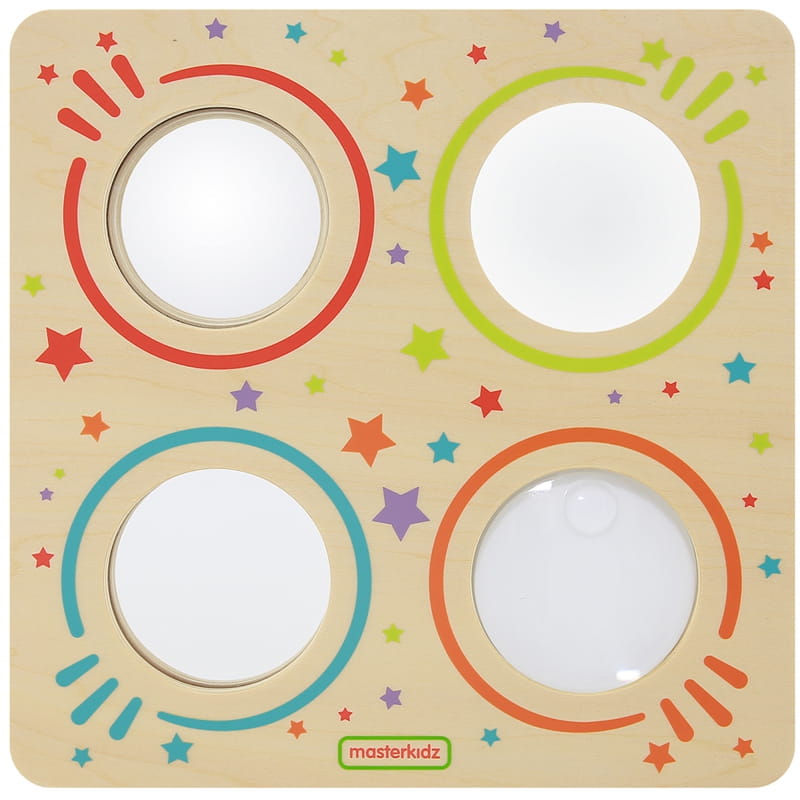 Fantastyczna zabawka sensoryczna firmy MSTERKIDZ, która nie tylko dostarcza mnóstwo rozrywki, lecz także uczy. Drewniana tabliczka wykorzystuje 3 rodzaje luster i soczewkę, by pokazać świat nieco inaczej, niż widzimy go gołym okiem. Dziecko może zobaczyć zakrzywiony obraz odbijany w lusterku wklęsłym, nieco inną jego wersję w lusterku wypukłym, oraz patrzeć na wszystko w przybliżeniu dzięki soczewce powiększającej. Ostatnie z luster to zwykłe lustro, w którym dziecko może się przeglądać, by wypracowywać samoświadomość i pewność siebie.