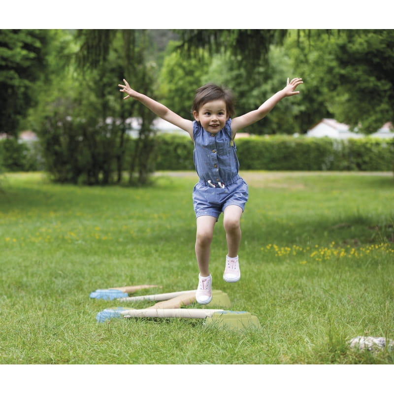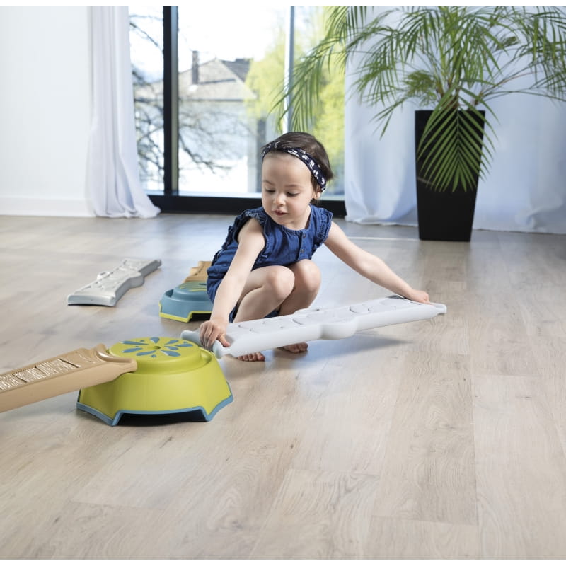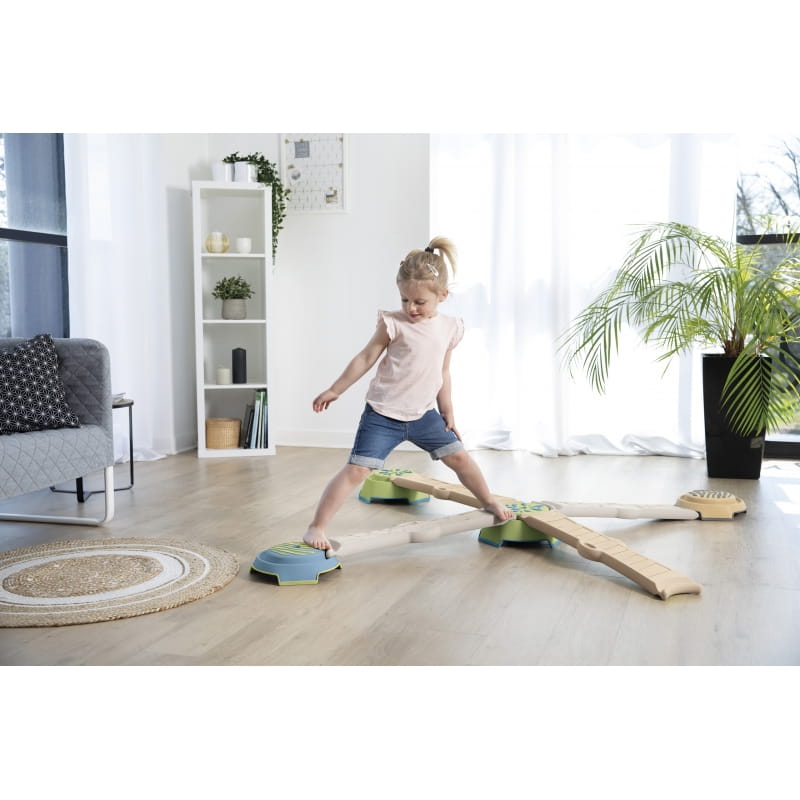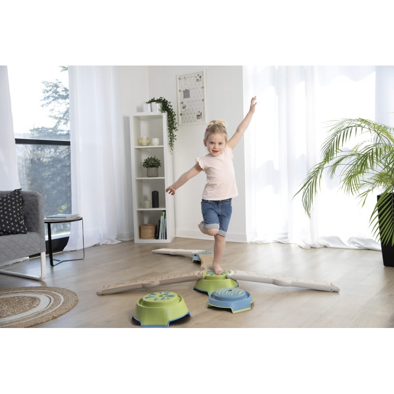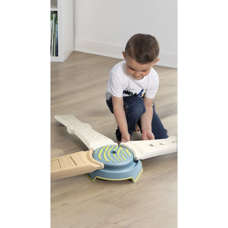 Zestaw składa się z czterech długich (70 cm) paneli o zróżnicowanej fakturze oraz czterech podstaw do ich mocowania. Możliwość dowolnej konfiguracji elementów pozwala stworzyć nawet 3,5-metrową trasę, dostosowaną do umiejętności dziecka. Ścieżkę warto przechodzić na boso, co zwiększa doznania sensoryczne i pozytywnie wpływa na rozwój układu nerwowego.
