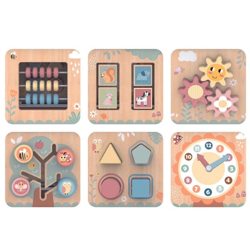 Drewniany multifunkcyjny sześciokąt z 7 aktywnościami od marki TOOKY TOY to interaktywna zabawka edukacyjna, która oferuje wiele różnych rodzajów zabawy na każdej ze swoich siedmiu stron. Dzieci mogą przesuwać koraliki w labiryntach, obracać koła zębate, dopasowywać kształty lub uczyć się zegara.