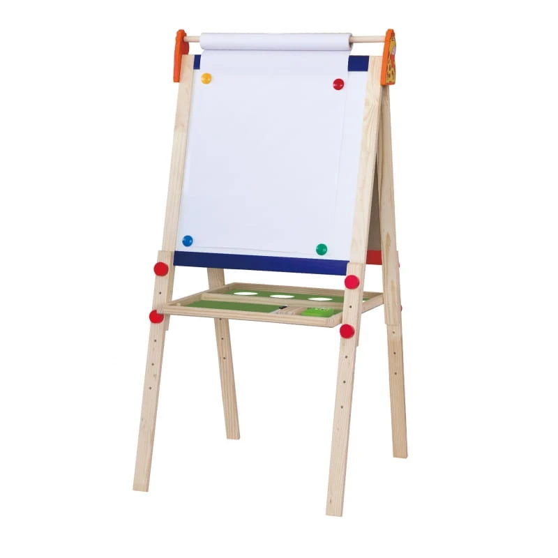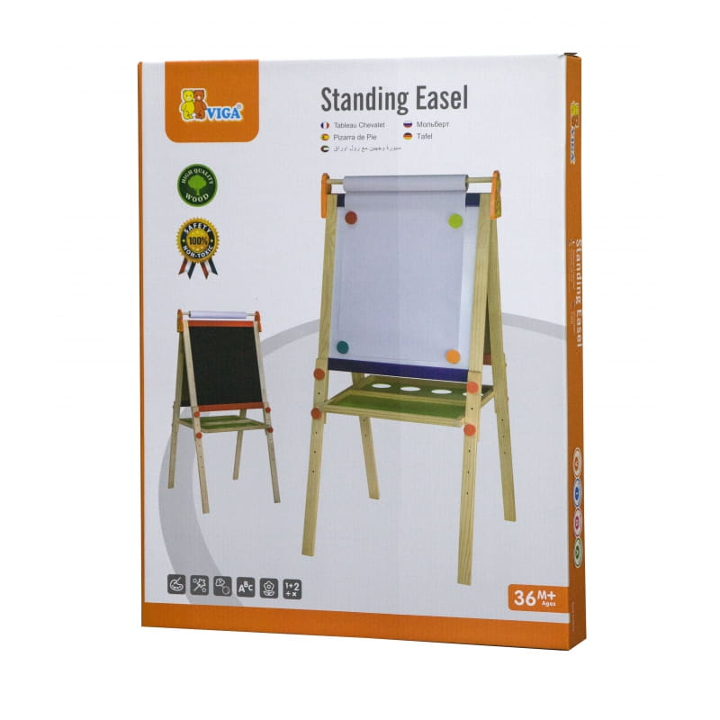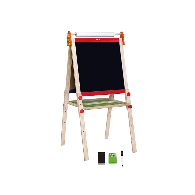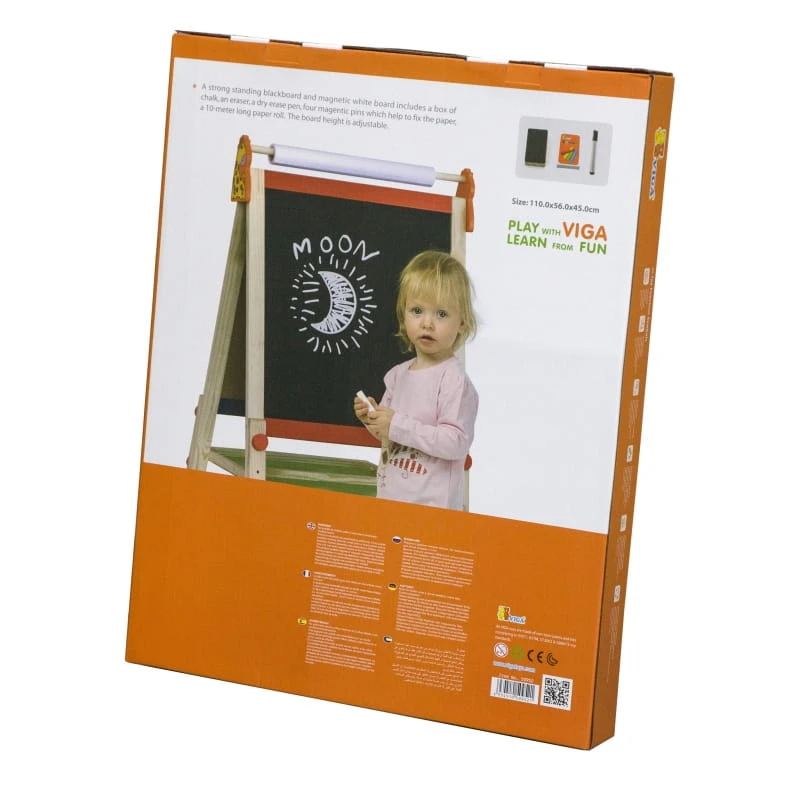 Dwuplanszowa tablica do rysowania firmy Viga Toys. Na jednej planszy można pisać kredą, a na drugiej mazakiem. Tablice są duże i wygodne, oraz umieszczone na stabilnym stelażu. Jest to idealny prezent dla każdego dziecka, którego pasją jest rysowanie. Kreatywna zabawa rozbudza wyobraźnię, oraz poprawia zmysł artystyczny.
