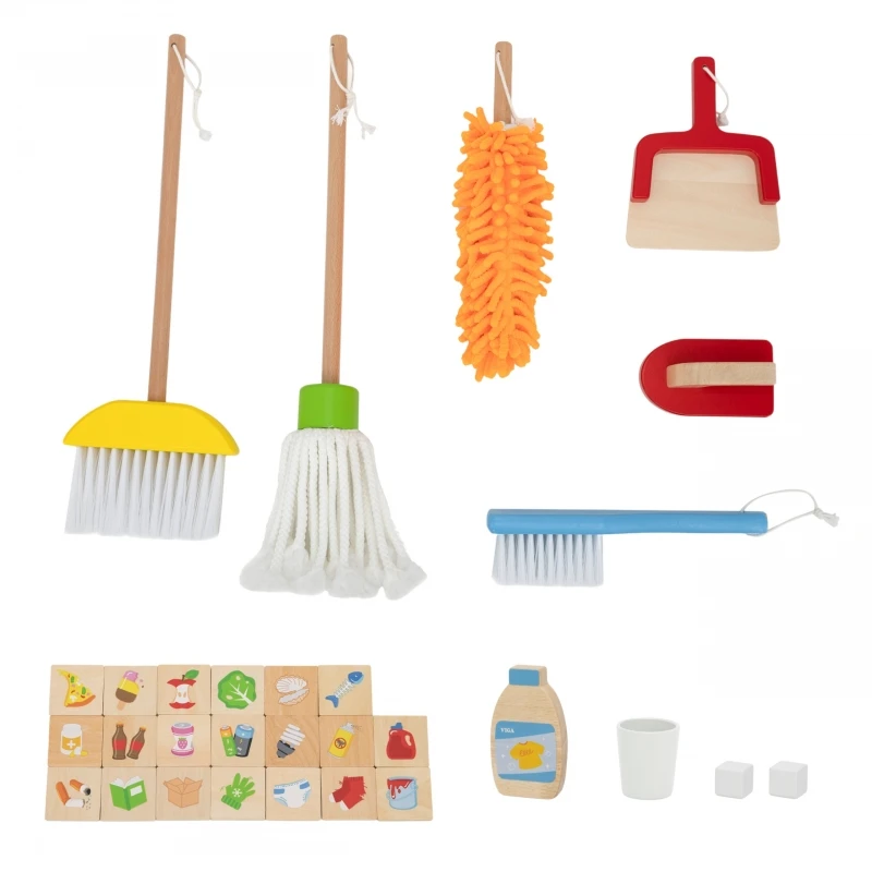 - 5 narzędzi do sprzątania (miotła, mop, szczotka, zmiotka, szufelka).