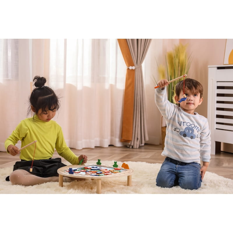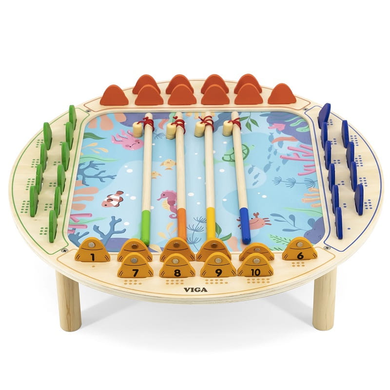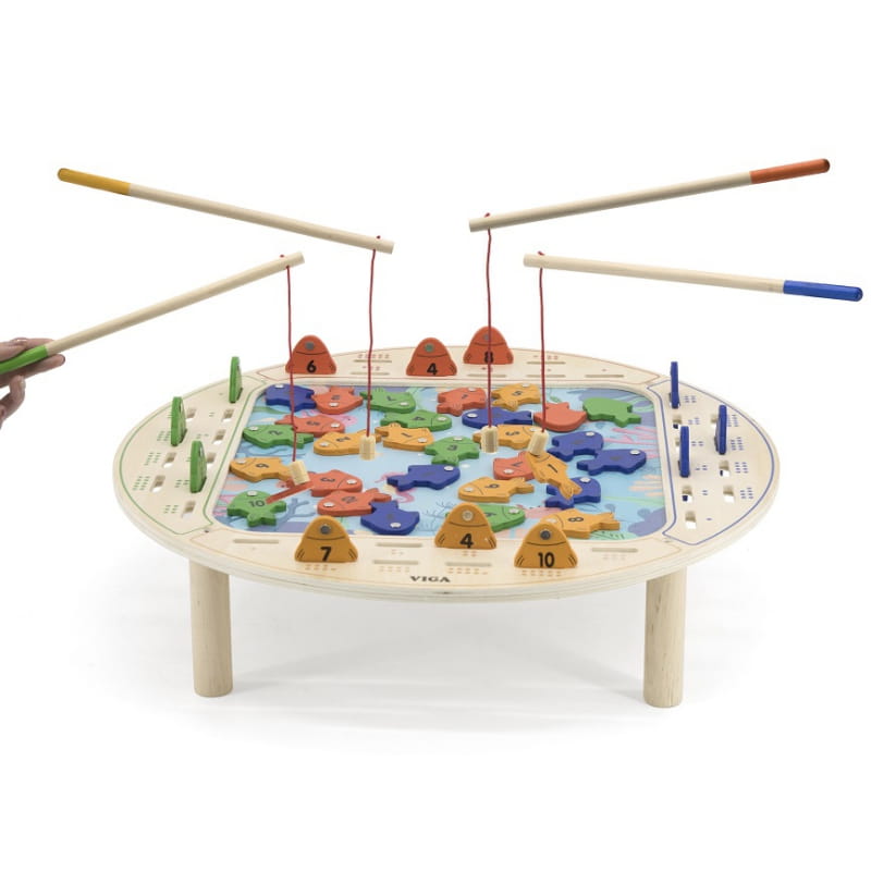 - zabawka zawiera - drewniany stół do gry, 4 wędki oraz 40 rybek,