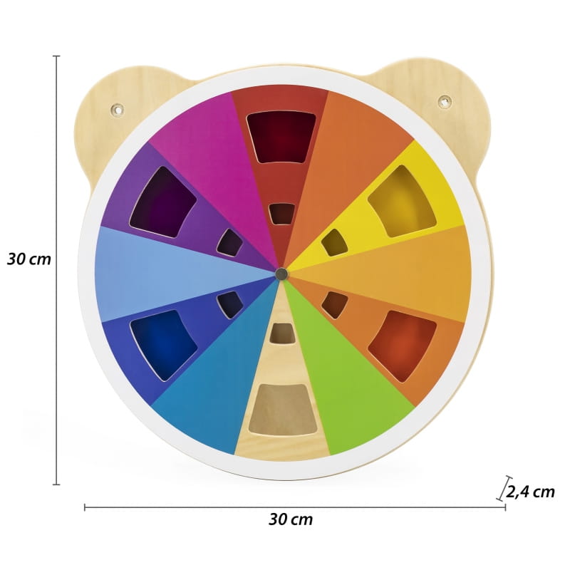 Jedna z serii drewnianych tablic z uroczą głową misia. Tablica z akrylową tarczą na przodzie w różnych odcieniach. Dziecko dzięki obracaniu tarczy tablicy może mieszać kolory w dowolny sposób i odkrywać jakie inne barwy powstają. W sumie można uzyskać 60 różnych kolorów. Produkt idealnie sprawdzi się zarówno w domowym zaciszu, jak i w placówkach oświatowych, wczesnoszkolnych. Ciekawe przygotowanie formy tablicy z pewnością przykuje uwagę każdego malucha. Całość wykonana została z drewna lakierowanego i pomalowana nietoksycznymi farbami w żywe barwy, które zadowolą każdego użytkownika i dadzą mnóstwo radości z zabawy. Produkt przeznaczony dla dzieci od 18 miesiąca życia. W naszej ofercie dostępna jest cała seria tablic z głową misia.