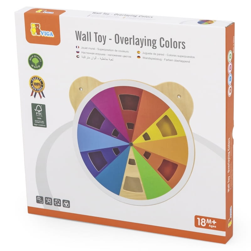 - zabawa polega na przekręcaniu akrylowej wierzchniej tarczy mieszając kolory z tarczą pod spodem i otrzymywania nowych barw w wyniku mieszania się dwóch innych kolorów