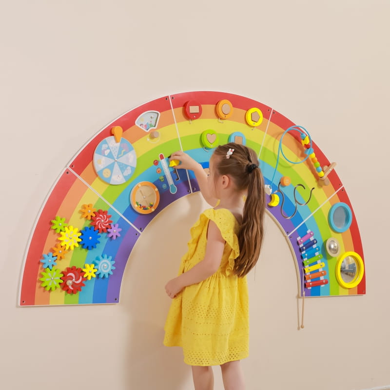 Tablica pogody została specjalnie zaprojektowana, aby pasowała do motywu tęczy. Zmieniający się panel pór roku można badać w połączeniu ze zmianami pogody i wahaniami temperatury. Podzielony na 5 części dla łatwego transportu i montażu. Wszystkie 5 części jest tej samej wielkości, dzięki czemu można je montować w dowolnej kolejności. Zakrzywiona konstrukcja zachęca dzieci o różnym wzroście do jednoczesnej zabawy i nauki podstawowych pojęć dotyczących kolorów, kształtów, dźwięków i pogody. Zabawka została zaprojektowana tak, aby stymulować zmysły i wspierać rozwój motoryki dziecka. To doskonałe ćwiczenie zręczności małych paluszków. Zabawka uczy również logicznego myślenia oraz cierpliwości. Idealne uzupełnienie środowiska wczesnej nauki i placówek opieki nad dziećmi.