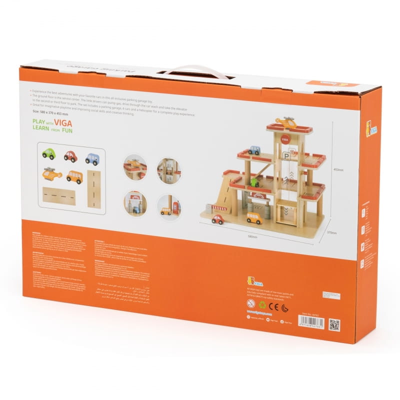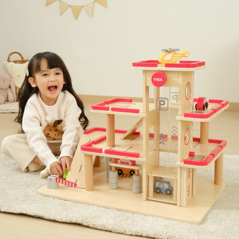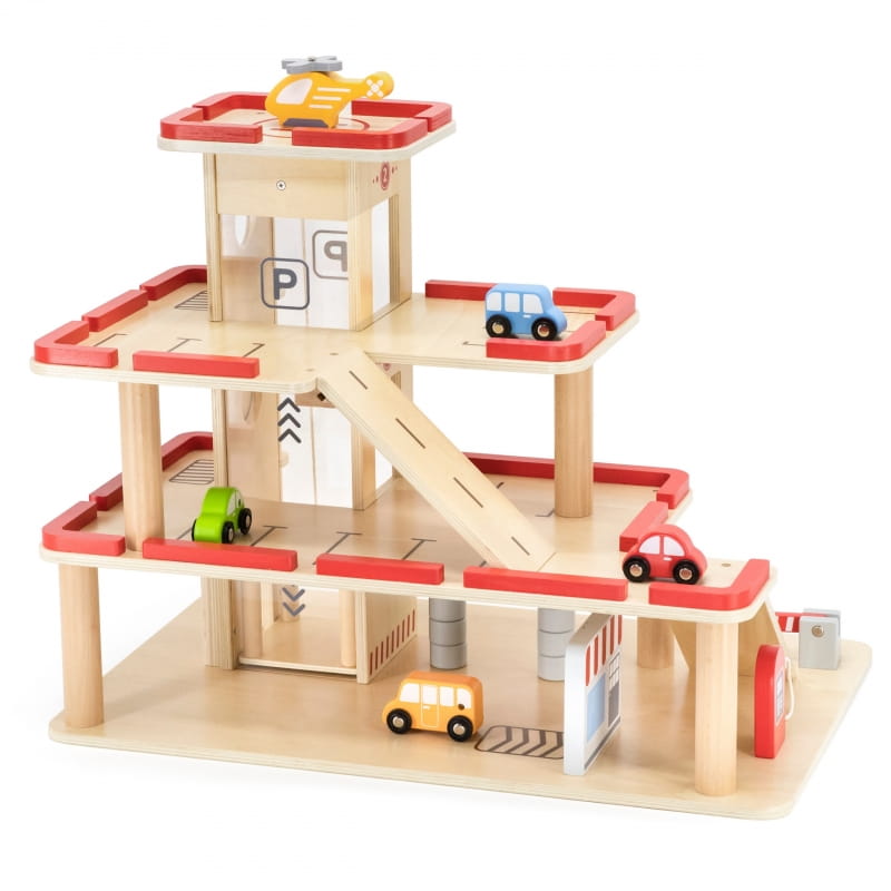 VIGA Drewniany Parking dla Samochodzików z Windą 4 Autka Helikopter