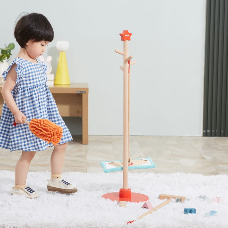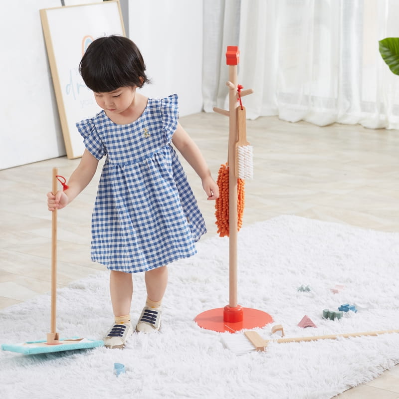 Sprzątanie zazwyczaj kojarzy się dzieciom dość negatywnie, jako przykry obowiązek czy nudne i męczące zajęcie. Zestaw do sprzątania to akcesoria dopasowane do małych pomocników, zarówno wielkością jak i ciężkością. Przedmioty można łatwo przechowywać za pomocą stojaka z czerwoną podstawą, na którym można je zawiesić. Dzięki zestawowi do sprzątania dziecko nauczy się sposobu, w jaki należy używać poszczególnych przedmiotów. Maluch nauczy się dbać o porządek i czystość w swoim pokoju.