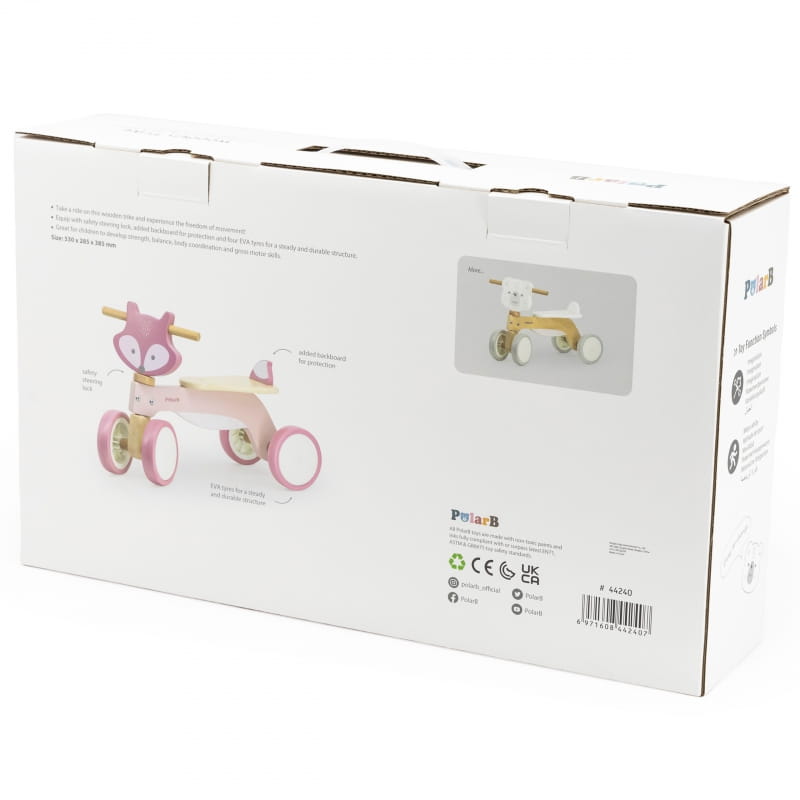 Drewniany Jeździk PolarB Lisek to urocza zabawka od firmy VIGA. Jest to idealny pojazd dla dziecka do rozwijania siły mięśniowej i koordynacji ruchowej podczas zabawy. Pastelowy jeździk w kształcie lisa zachęci malucha do aktywności fizycznej i odkrywania świata. Kolorowy pojazd to fantastyczna zabawka, która umożliwi maluchowi wielogodzinną, radosną zabawę.