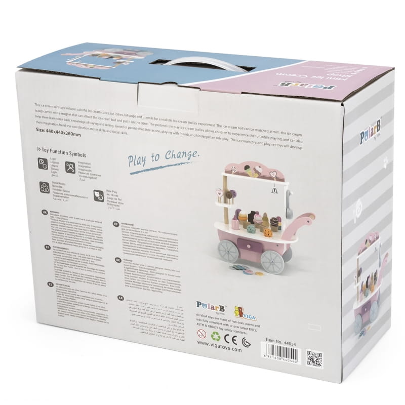Sklep, Cukiernia, Lodziarnia 3w1 z serii PolarB jest doskonałym prezentem dla małych cukierników. Zestaw jest idealny dla dziecka, które chce wcielić się w rolę sprzedawcy czy cukiernika. Dzięki tej zabawce dziecko poczuje się jak profesjonalny sprzedawca słodkości. Zabawka posiada wiele drobniejszych akcesoriów takich jak lizaki, lody, wafelki czy polewy. W wózeczku znajduje się półeczka, którą można otwierać i chować do niej różne rzeczy. Całość pomalowana jest nietoksycznymi farbami w łagodnej kolorystyce przyciągającej uwagę dziecka.